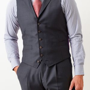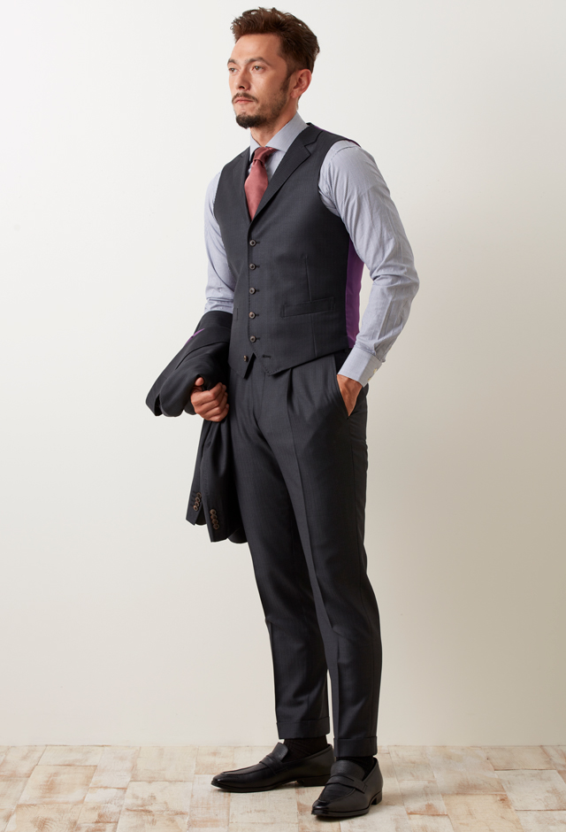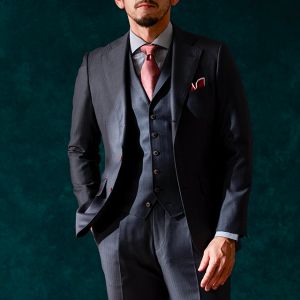 イタリアの高級生地ブランド「ゼニア」で仕立てたスーツです。品ある光沢感で華やぐ落ち着いたトーンのグレーシャドーストライプのスタイルで、オールシーズン着用していただけます。ミケランジェロレジェロモデルで、一度羽織ると手放せなくなる軽い着心地を感じていただけます。スリーピースのベストには襟付きのラペルドベストをチョイス。さらに、ラペルには手縫い風のステッチを入れることで首元に印象を。暖色系の明るい色のタイとチーフで人目を惹くコーデです。※生地在庫は変動いたしますのでご了承くださいませ。