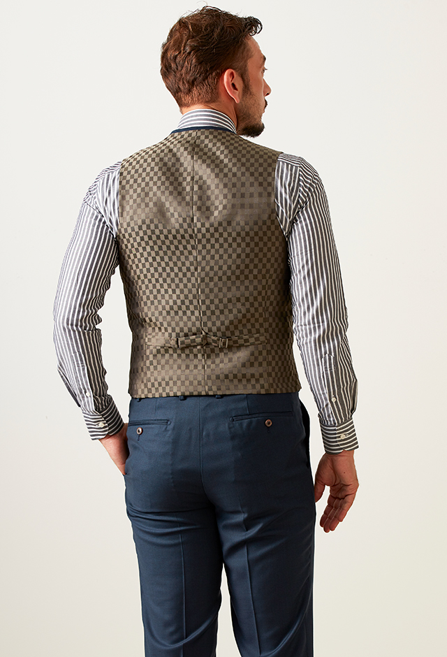 生地本来の持つ雰囲気にこだわるイタリアのブランド「グアベロ」で仕立てたスーツです。定番のネイビーにトレンドのグリーンが入った無地のスタイルで、オールシーズン着用していただけます。クラシックな部分とセクシーさを融合したモダンクラシックモデルで仕立てました。裏地にはトレンドのアースカラーを使い、ジャケットを脱いだ時にベストの裏地が粋な演出。チーフにはグリーンを入れて、スーツのグリーンを引き出す色どりあるコーデです。※生地在庫は変動いたしますのでご了承くださいませ。