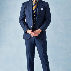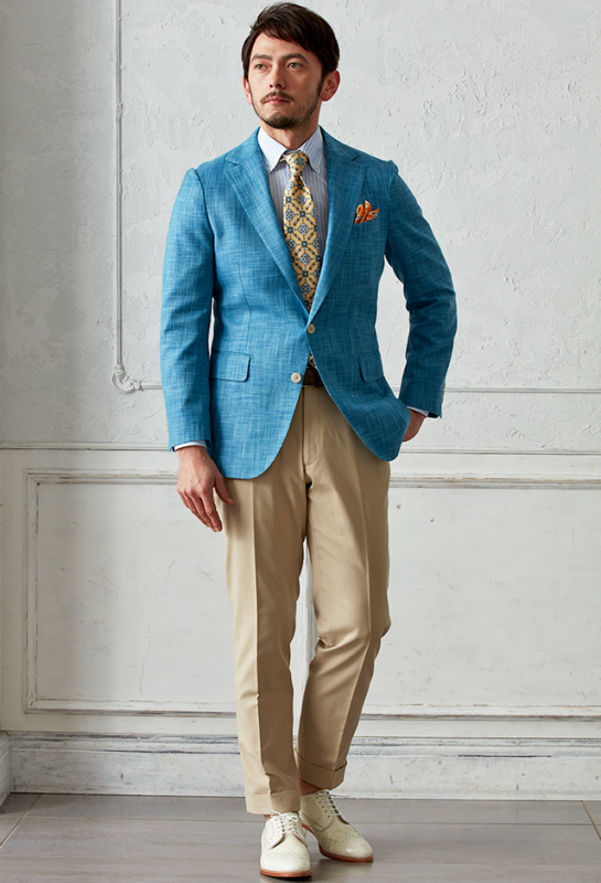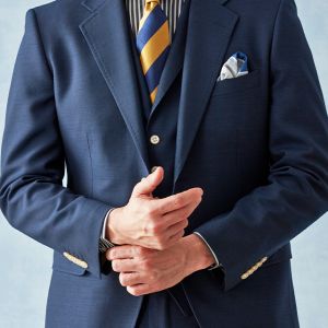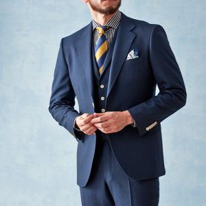 80ケ国以上にファンを持つ世界的なイギリスブランド「ドーメル」で仕立てたスーツです。少しグリーンがかった美しい発色のブルーの無地の生地で、オールシーズン着用していただけます。人気の英国系モデル・モダンブリティッシュモデルで仕立てました。オプションには少し深めのミシンステッチでスーツの襟元を柔らかく演出しました。大き目の柄と明るめの黄色が印象的なネクタイにストライプのシャツで存在感をアピールできるコーデです。※生地在庫は変動いたしますのでご了承くださいませ。