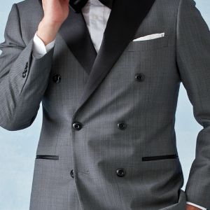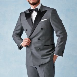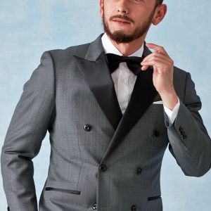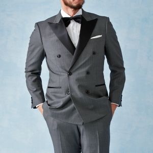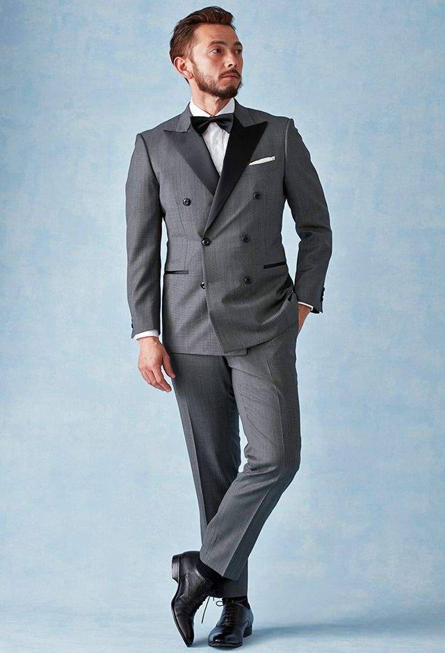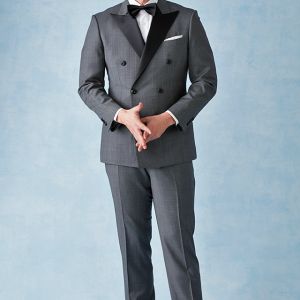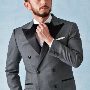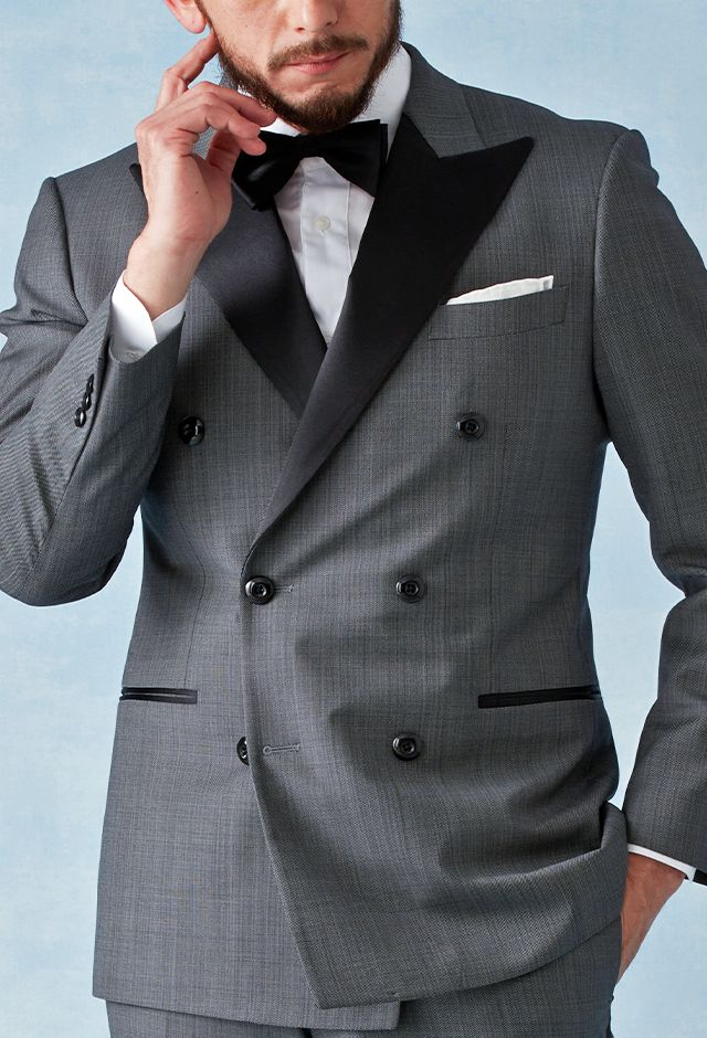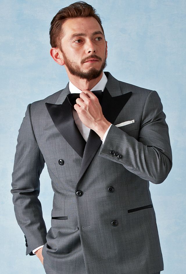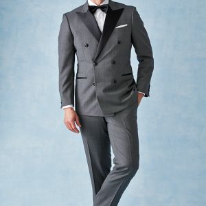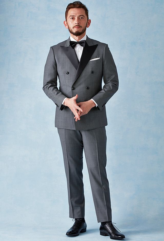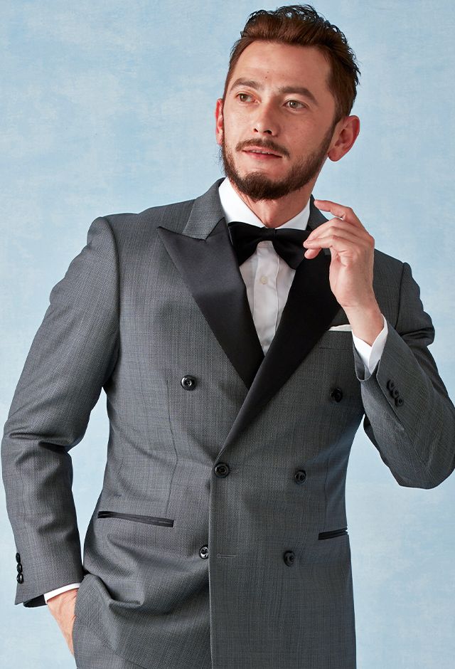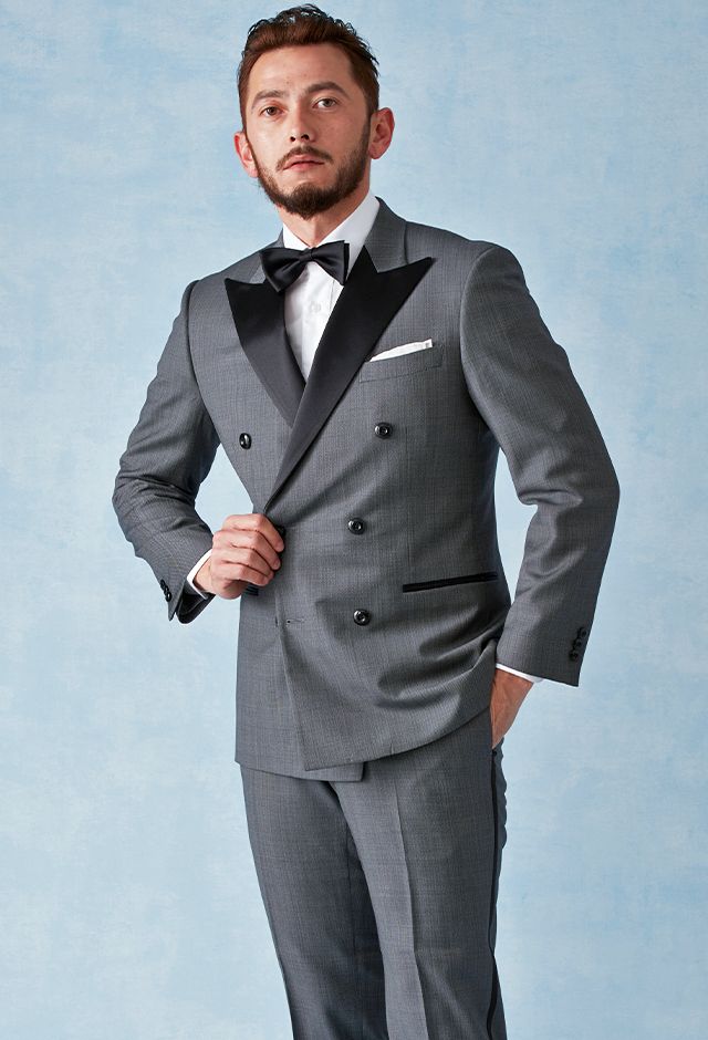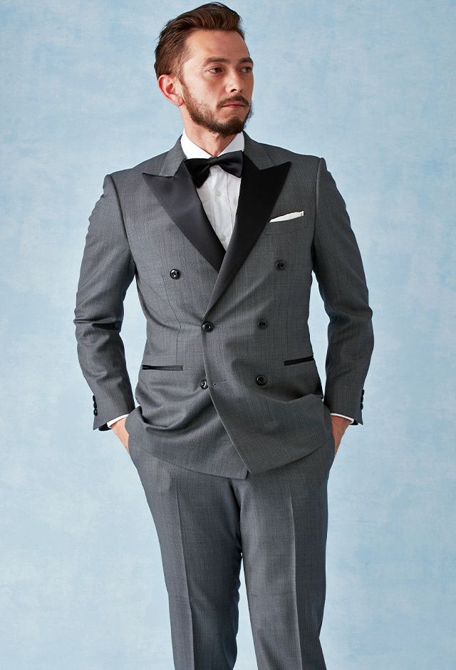 クラシカルからファンシーなデザインまで幅広く生み出すイタリアブランド「レダ」で仕立てたタキシードスーツです。落ち着きと上品さのあるミディアムグレーの無地で、オールシーズン着用していただけます。大人の色気を醸し出す優美なフォルムが特徴のダブルブレスト×ピークドラペルで仕立てました。衿の拝絹カラーはブラックをチョイス。(ネイビーorブラックが選べます)格式高くエレガントな印象に。タキシードスタイルによく合う蝶ネクタイを合わせたフォーマルスタイルです。※ダブルブレストモデルは税込+5,500円となります※生地在庫は変動いたしますのでご了承くださいませ。