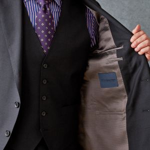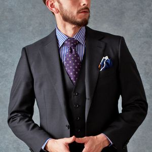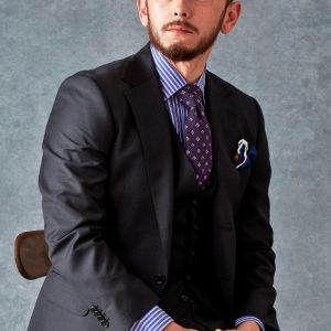 イタリアの高級生地ブランド「ゼニア」で仕立てたスーツです。落ち着いた嫌味のない光沢が特徴のチャコールグレーの無地で、春夏シーズンの生地になります。クラシックな部分とセクシーさを融合したモダンクラシックモデルで仕立てました。トーンを抑えた同系色のボタンをチョイスし、使えるシーンを選ばない仕様に。パープルの柄のネクタイに、爽やかなブルーストライプシャツを組み合わせた大人のスタイリッシュコーデで仕上げました。※生地在庫は変動いたしますのでご了承くださいませ。