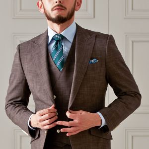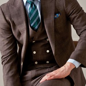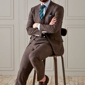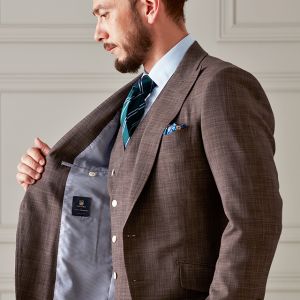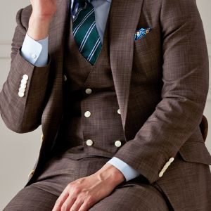 最高級ブランドに使われる素材を生み出すイタリアブランド「ルイージ・コロンボ」で仕立てたスーツです。織りが美しいブラウンの平織の無地で、春夏シーズンの生地になります。クラシックな部分とセクシーさを融合したモダンクラシックモデルで仕立てました。英国紳士を思わせる襟なしダブルベストで、格式高いシックなこなれ感を演出。ベーシックな水色のシャツに、落ち着いたグリーンのネクタイを合わせ、大人の落ち着いたブラウンコーデに仕上げました。※生地在庫は変動いたしますのでご了承くださいませ。