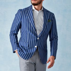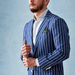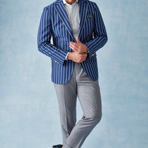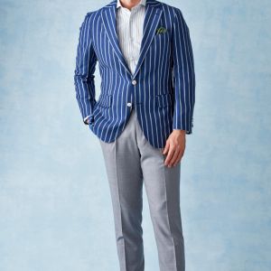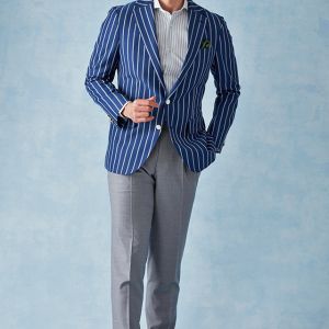 高品質でコストパフォーマンスに優れたイタリアブランド「カノニコ」で仕立てたスーツです。発色の良いブルーをベースに、白が華やぐボールドストライプで、春夏シーズンの生地になります。肩パットや芯地を極力排したアンコンモデルでジャケットを仕立てました。ジャケットのストライプになじむよう、ホワイトシルバーボタンをチョイスし統一感を。清潔感のある白地にストライプのシャツを襟を開いて着こなせば、春夏のさわやかコーデに。※生地在庫は変動いたしますのでご了承くださいませ。