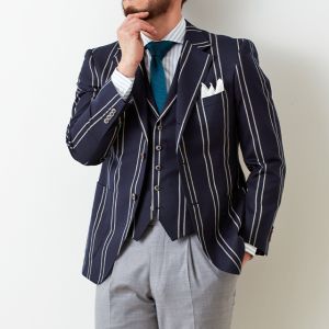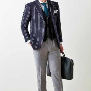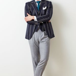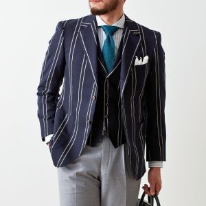 フランネルの創設者として公認されているイギリスの高級ブランド「フォックスブラザーズ」で仕立てたスーツです。ベースのネイビーに白の2本並んだストライプが印象的な生地で、オールシーズン着用していただけます。人気の英国系モデル・モダンブリティッシュモデルで仕立てました。裏地には、ツヤのある同系のブルーをチョイス。ライトグレーのスラックスと白地のシャツ、チーフで清潔感を出した、遊び心のある紺ブレスタイル。※生地在庫は変動いたしますのでご了承くださいませ。