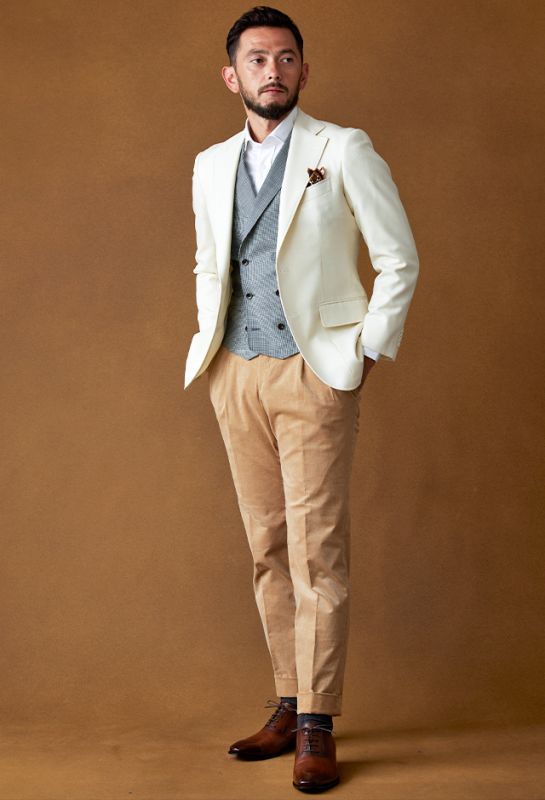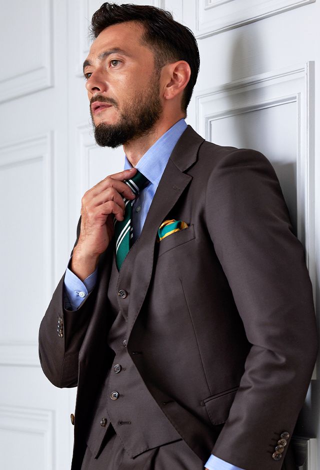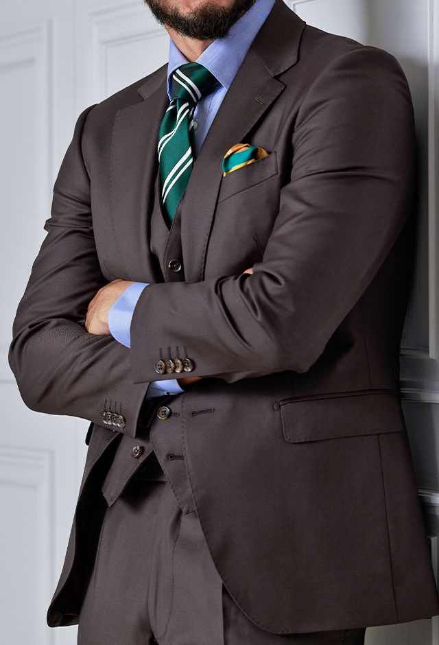 雨が多く多湿な気候を有する市場においても絶大な評価を獲得している「ドラゴ」で仕立てたスーツです。品のある光沢感とやや赤みがかったブラウンのスタイルで、オールシーズン着用していただけます。コンパクトな着丈とシャープなフロントのカッタウェイラインが特徴のニュービスポークモデルで仕立てました。同系色のボタンやペイズリー柄の裏地で統一感を演出。アースカラーのネクタイなどの小物アイテムと組み合わせて、トレンド感のあるお洒落なコーデです。※生地在庫は変動いたしますのでご了承くださいませ。