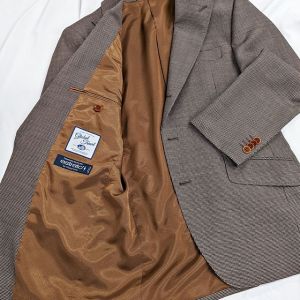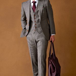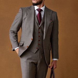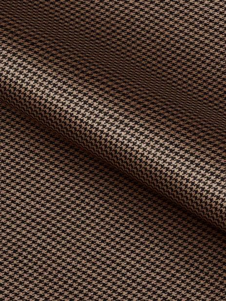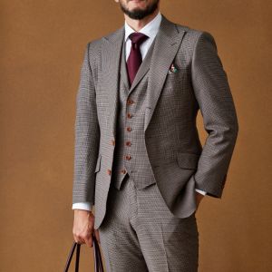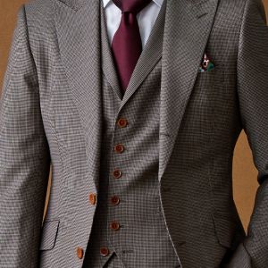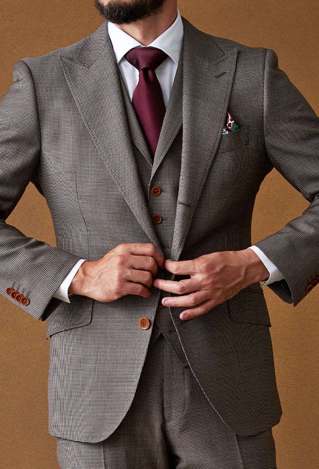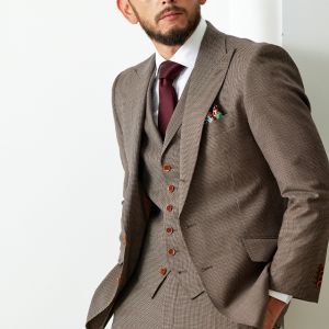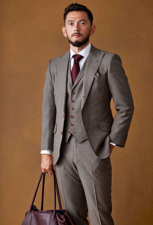ストレッチ性の高い生地が大好評のイタリアブランド「トラバルド・トーニャ」で仕立てたスーツです。ブラウンをベースに細かな千鳥格子のスタイルで、オールシーズン着用していただけます。クラシックな部分とセクシーさを融合したモダンクラシックモデルで仕立てました。襟付きのベストと存在感のあるライトブラウンの本ナットのボタンがクラシック感を際立たせます。シンプルなシャツに、ブラウンと相性の良いレッドやダークブラウンのアイテムを合わせ全体に統一感をもたせたコーデです。※生地在庫は変動いたしますのでご了承くださいませ。