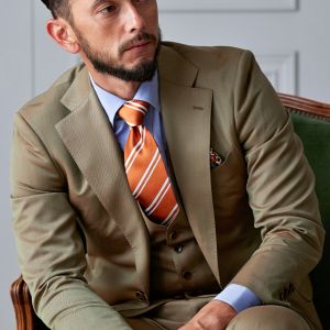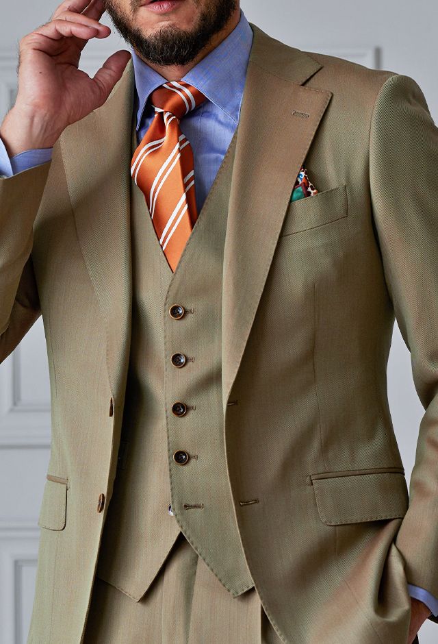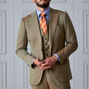 雨が多く多湿な気候を有する市場においても絶大な評価を獲得している「ドラゴ」で仕立てたスーツです。明るめのベージュ×角度によって色が変わるソラーロ生地のスタイルで、オールシーズン着用していただけます。最高峰グレードの「カイザーモデル」で極上の着心地を味わうことが出来ます。焼き水牛のボタンでクラシカル感を、ベストもセットのスリーピースでフォーマル感や重厚感も演出。ネクタイのオレンジカラーをアクセントにして、暖かみのある雰囲気に仕上げました。※生地在庫は変動いたしますのでご了承くださいませ。