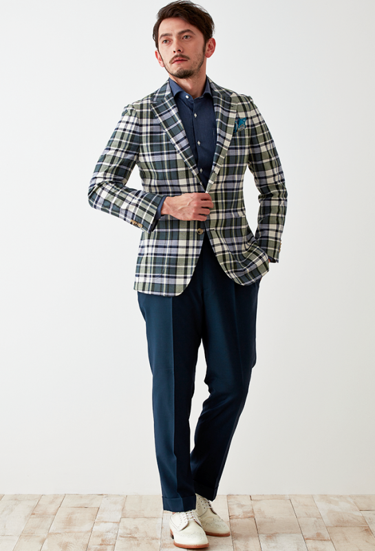 ファッション性が高くお洒落な生地が豊富な「アリストン」で仕立てたスーツです。グリーンに存在感のあるチェックが入ったインパクトあるスタイルで、オールシーズン着用していただけます。クラシックな部分とセクシーさを融合したモダンクラシックモデルで仕立てました。ジャケットのボタンは重ねボタンにすることで立体的な印象をアップ。ネクタイや裏地はチェックのカラーと合わせてブルーを取り入れ統一感のあるコーデに仕上げました。※生地在庫は変動いたしますのでご了承くださいませ。