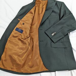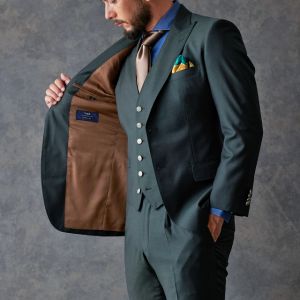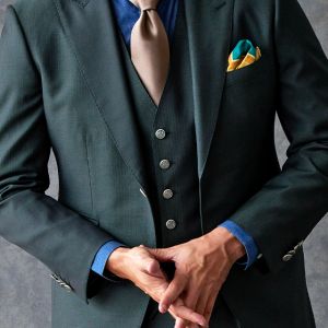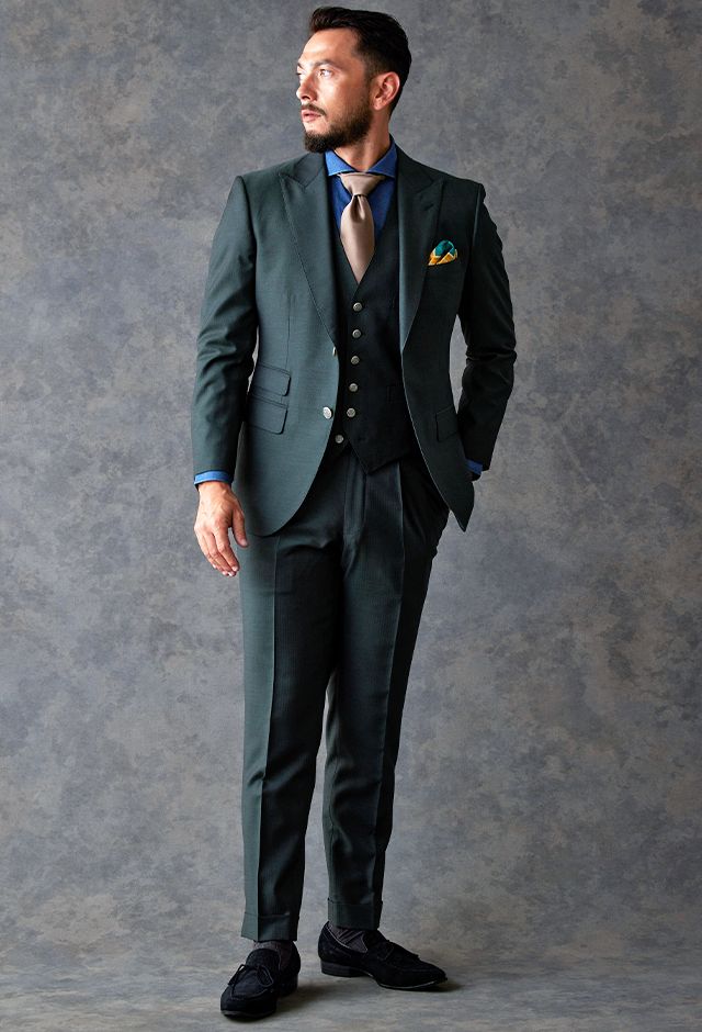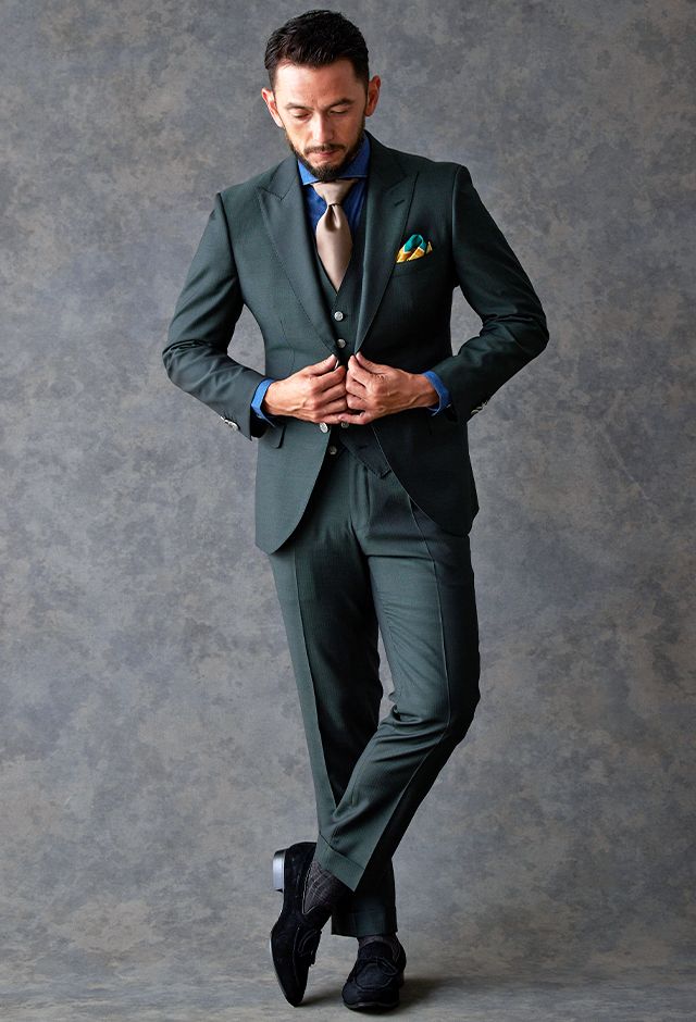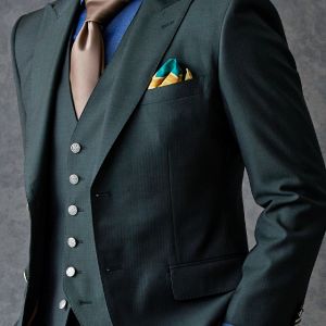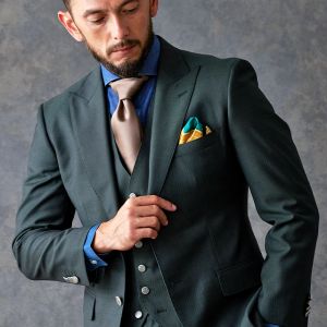 トレンドをふんだんに取り入れたデザイン性が特徴の「マルゾット」で仕立てたスーツです。トレンド感のあるグリーン×ヘリンボーンのスタイルで、オールシーズン着用していただけます。人気の英国系モデル・モダンブリティッシュモデルで仕立てました。シルバーのメタルボタンで存在感を出し、裏地にはグリーンと相性の良いブラウンを合わせました。鮮やかなイエローのチーフをアクセントに、ブルー、ブラウン、グリーンをバランス良くまとめました。※生地在庫は変動いたしますのでご了承くださいませ。