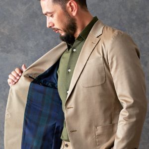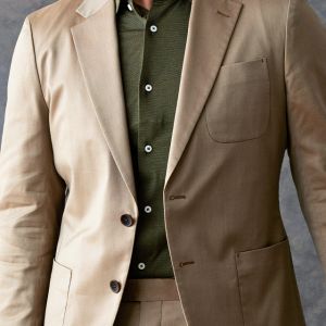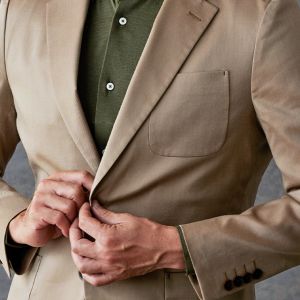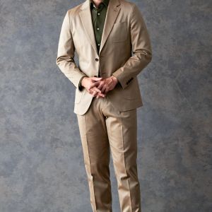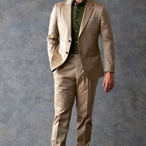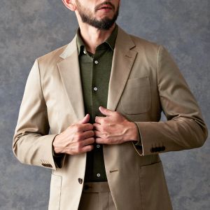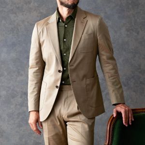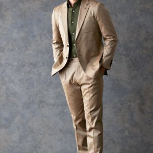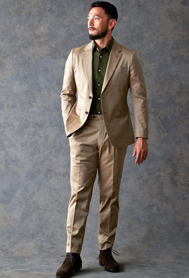 軽くて着心地の良い、サラリとした肌触りのセットアップスーツ専用生地で仕立てたセットアップです。滑らかな艶感が美しいベージュ無地のスタイルで、オールシーズン着用していただけます。オーダースーツ専門店が仕立てる、「Y.E」モデルで仕立てました。胸ポケットや脇ポケットはそれぞれアウトポケットをオプションで取り入れ、セットアップと相性の良いカジュアル感を演出。シャツにはカーキをチョイスし、トレンド感のあるアースカラーでまとめたコーデです。※生地在庫は変動いたしますのでご了承くださいませ。