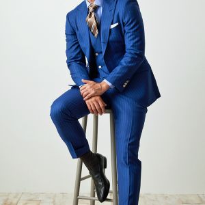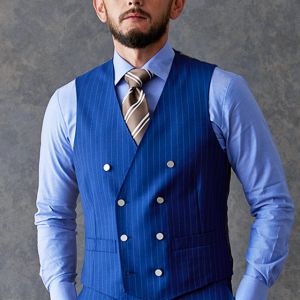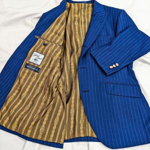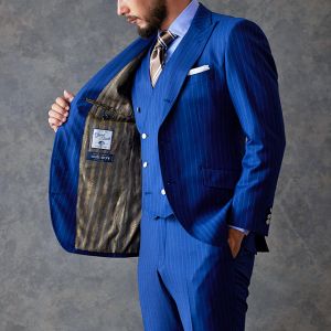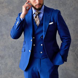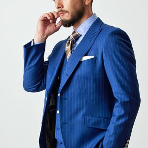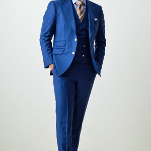 ストレッチ性の高い生地が大好評のイタリアブランド「トラバルド・トーニャ」で仕立てたスーツです。色鮮やかなブルーにホワイトのストライプ柄のスタイリッシュなスタイルで、オールシーズン着用していただけます。人気の英国系モデル・モダンブリティッシュモデルで仕立てました。印象的なゴールドの裏地を取り入れ華やかな雰囲気に。ベストもセットのスリーピースでフォーマル感や重厚感をプラス。ホワイトのチーフを差し色にブルーでまとめた清涼感のあるコーデです。※生地在庫は変動いたしますのでご了承くださいませ。