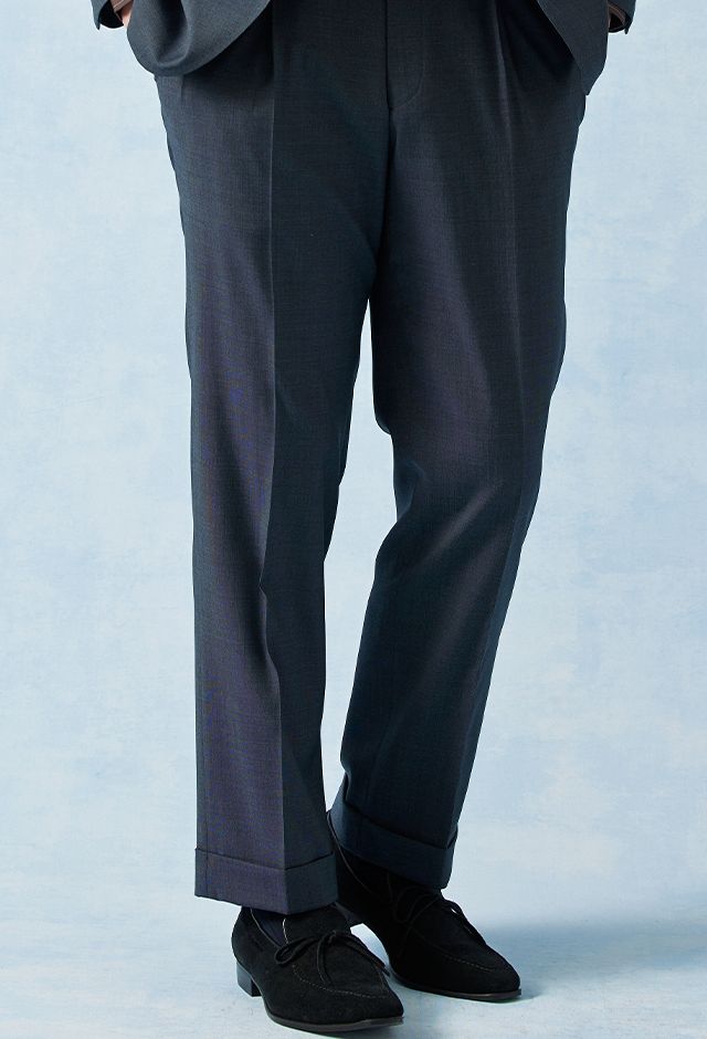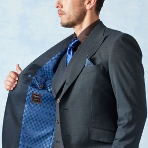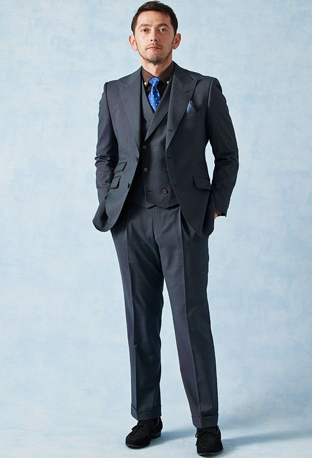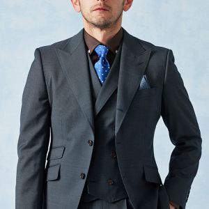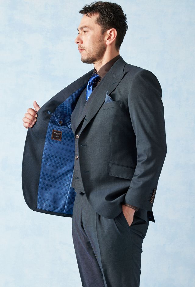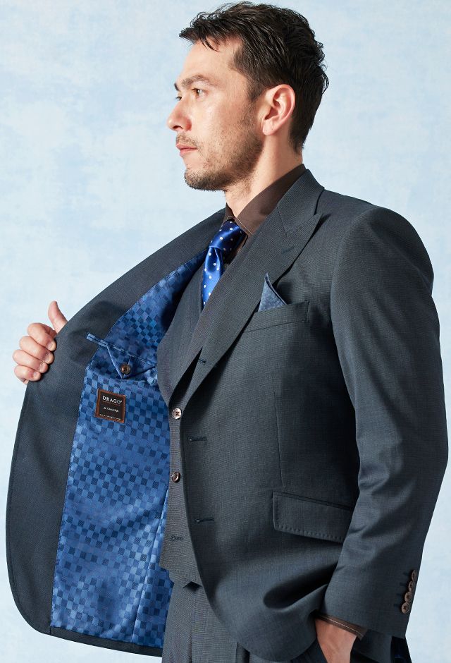 雨が多く多湿な気候を有する市場においても絶大な評価を獲得している「ドラゴ」で仕立てたスーツです。味わいのある色味が特徴グリーンカラーに立体感のあるバーズアイ柄のスタイルで、オールシーズン着用していただけます。人気の英国系モデル・モダンブリティッシュモデルで仕立てました。ジャケットの襟は、ダブルスーツで多く採用されるピークドラペルをシングルスーツでも採用。暖色のブラウンと寒色のブルーのアイテムでメリハリのあるコーデに仕上げました。※生地在庫は変動いたしますのでご了承くださいませ。