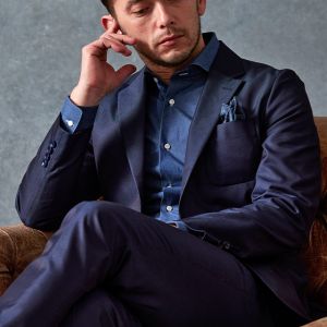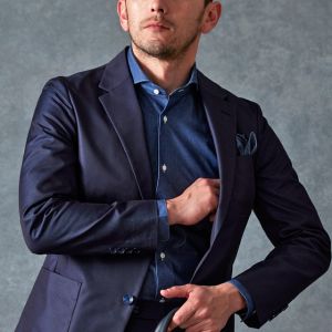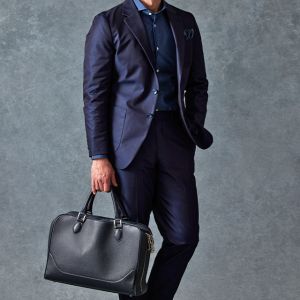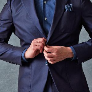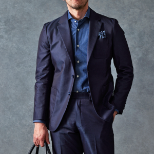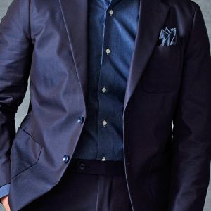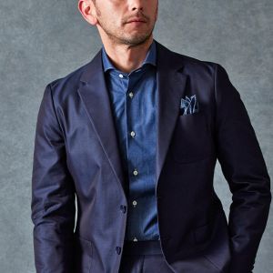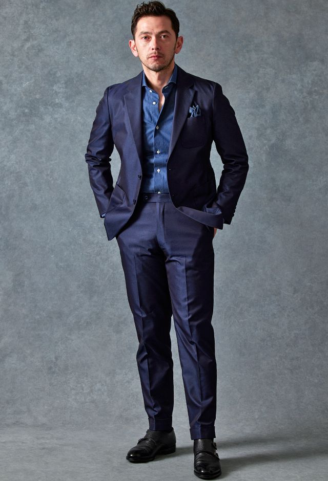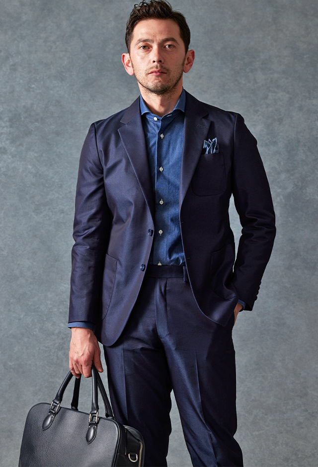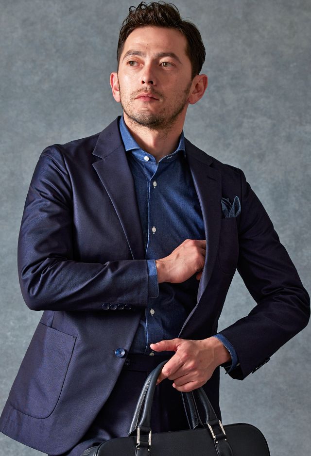 軽くて着心地の良い、サラリとした肌触りのセットアップスーツ専用生地で仕立てたセットアップです。魅力的な美しい艶感のネイビー×無地スタイルで、オールシーズン着用していただけます。オーダースーツ専門店が仕立てる、「Y.E」モデルで仕立てました。アウトポケットをオプションで取り入れ、仕事着とは違ったカジュアルな印象のある仕上がりに。デニムシャツやブルーのポケットチーフで、統一感を感じられるコーデに仕上げました。※生地在庫は変動いたしますのでご了承くださいませ。