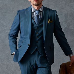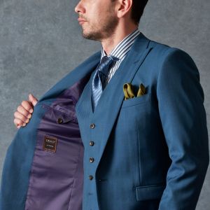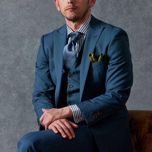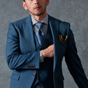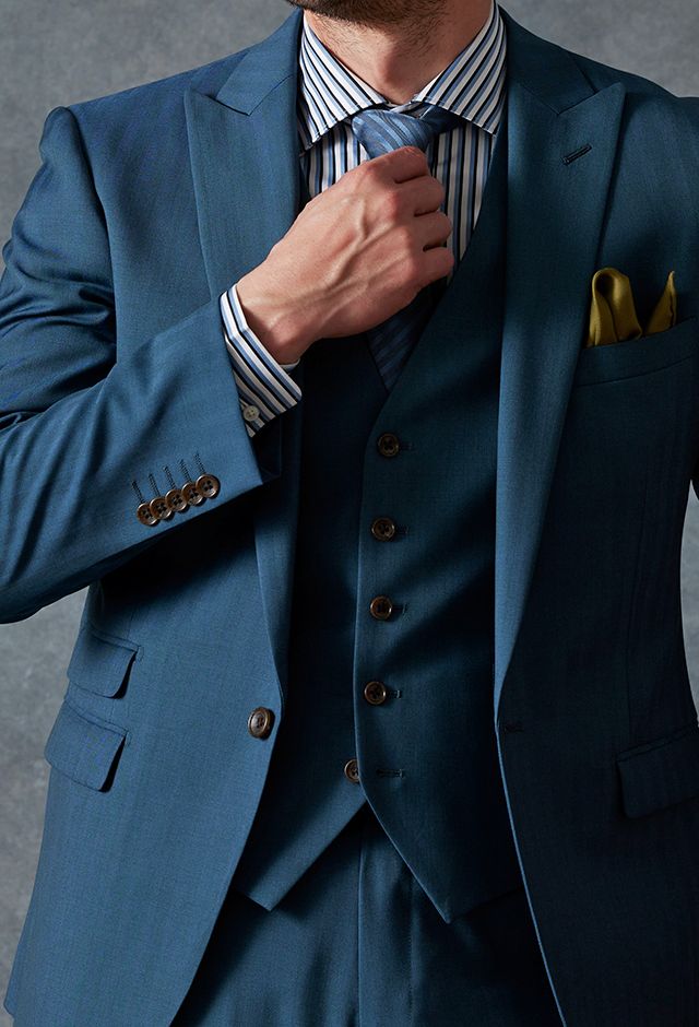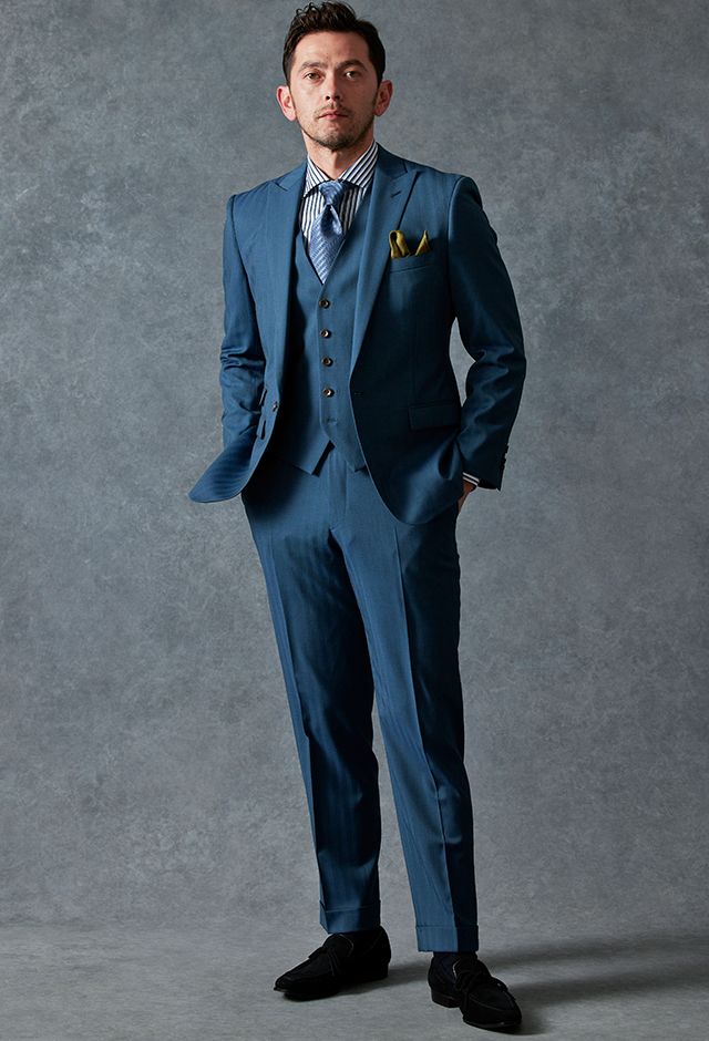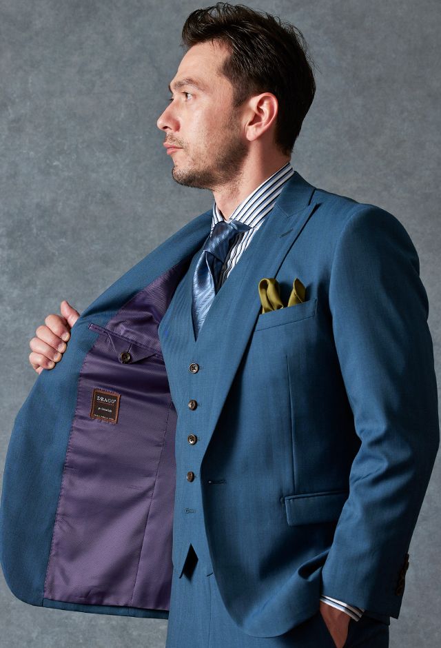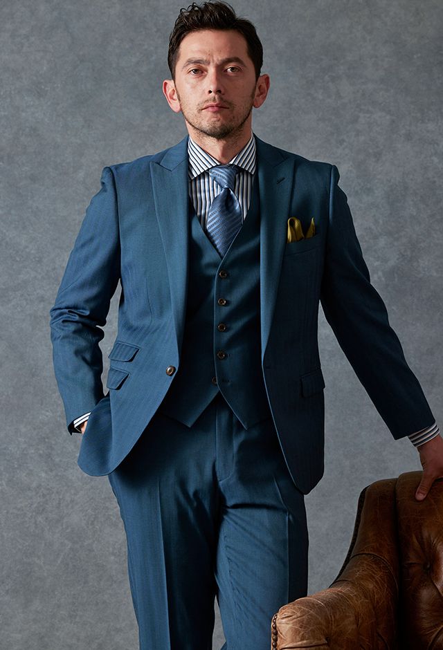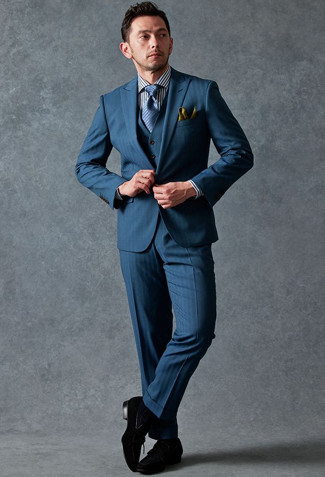 雨が多く多湿な気候を有する市場においても絶大な評価を獲得している「ドラゴ」で仕立てたスーツです。流行のグリーンカラーに上品なヘリンボーンストライプが組み合わさったスタイルで、オールシーズン着用していただけます。モードな空気感を醸し出すことが出来るスリムフィットモデルでお仕立てしました。小さいポケットが追加されたチェンジポケットオプションで、オーダーならではの嗜みを。シャツやネクタイはスーツと同じストライプ柄をチョイスし、統一感を演出しました。※生地在庫は変動いたしますのでご了承くださいませ。