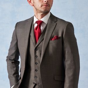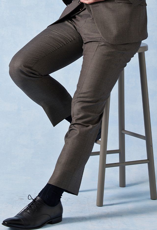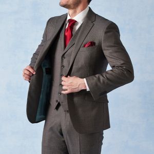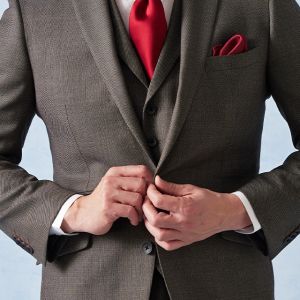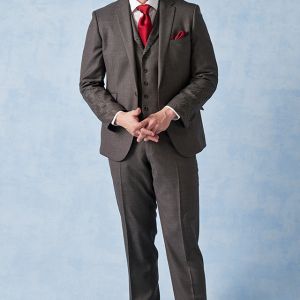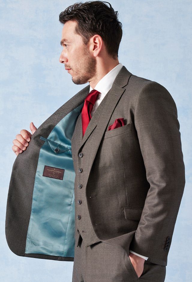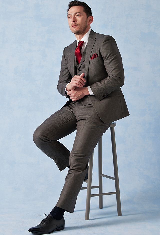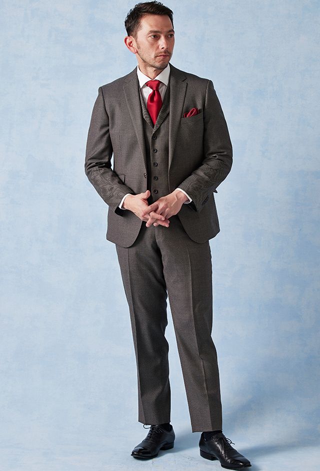 高品質でコストパフォーマンスに優れたイタリアブランド「カノニコ」で仕立てたスーツです。グレーカラーに立体感のあるバーズアイ柄のスタイルで、オールシーズン着用していただけます。モードな空気感を醸し出すことが出来るスリムフィットモデルでお仕立てしました。裏地には明るいカラーのスカイブルー。ボタンは重ねボタンにすることで手元に立体感を持たせてくれます。印象的なワインレッドのアイテムで揃え、大人の魅力を引き立てたコーデに仕上げました。※生地在庫は変動いたしますのでご了承くださいませ。