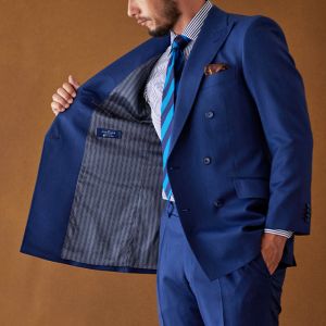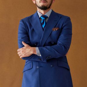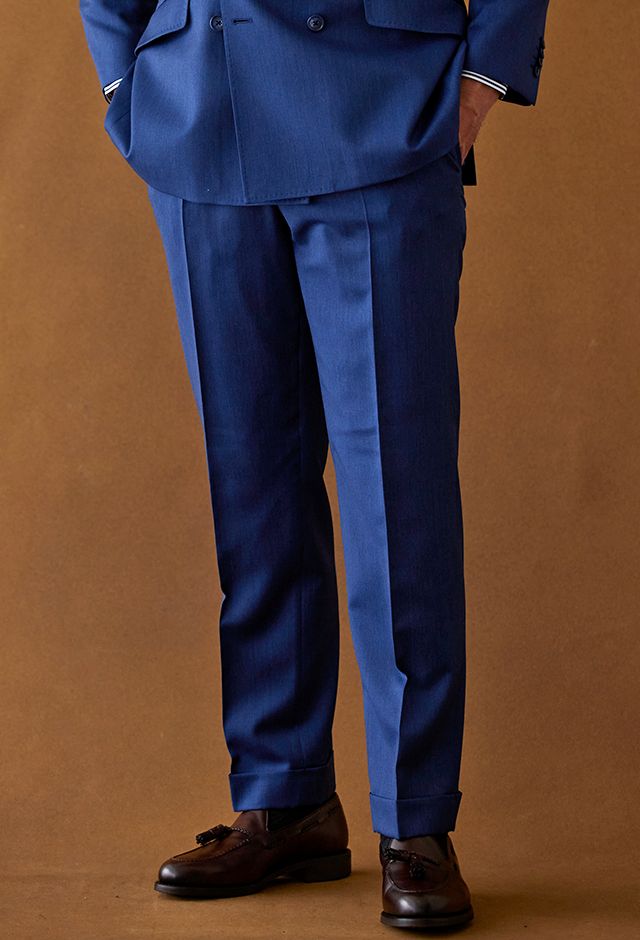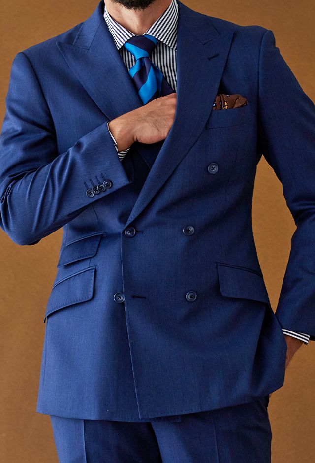 コストパフォーマンスの高さもからも支持されている「アンジェリコ」でお仕立てしたスーツです。クールな印象のブルーグレーで織り目の美しい生地で、秋冬シーズンの生地になります。大人の色気を醸し出す優美なフォルムが特徴のモダンクラシックモデル(ダブル)で仕立てました。裏地にストライプ柄をチョイスし、ポケットはオプションのチェンジポケット付きの斜め(スラント)にすることにでシャープでこだわりのある一着に。アイテムをストライプ柄でまとめつつもチーフを差し色にした、感度の高いコーデに仕上げました。※生地在庫は変動いたしますのでご了承くださいませ。
