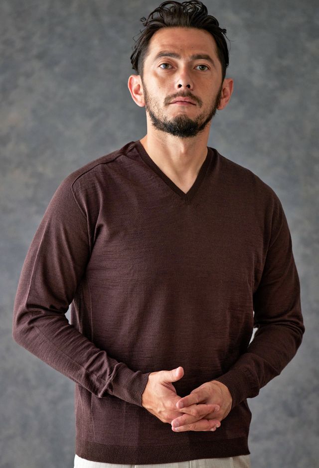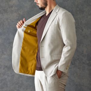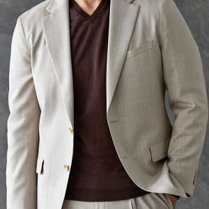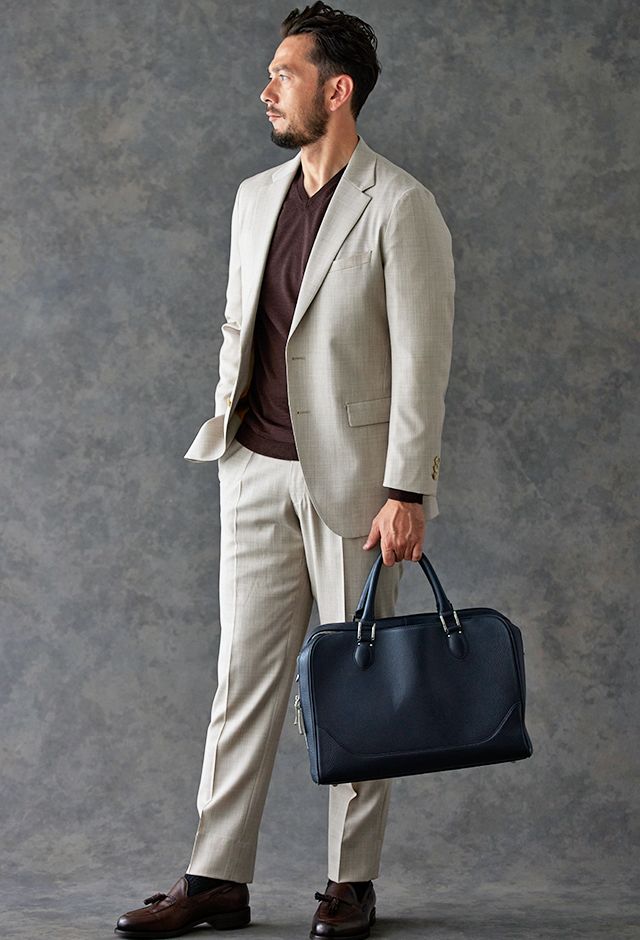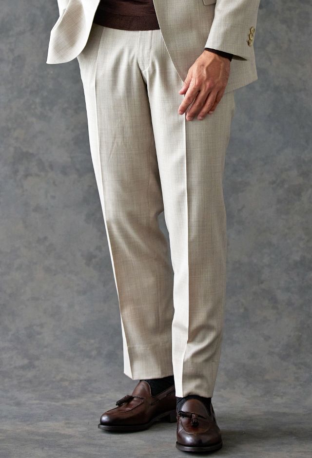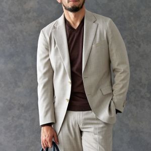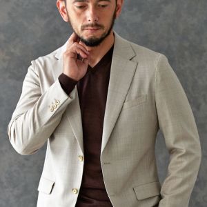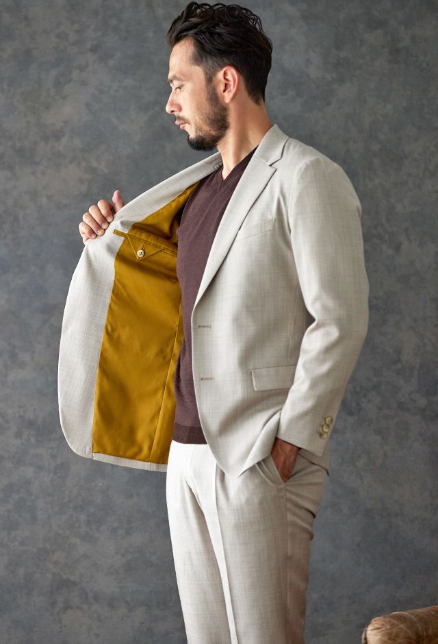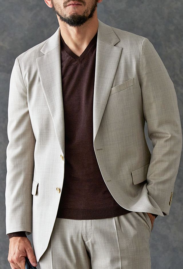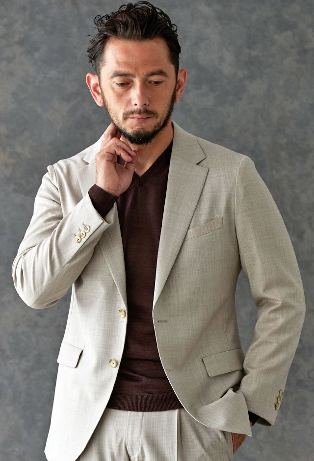 ストレッチ性の高い生地が大好評のイタリアブランド「トラバルド・トーニャ」で仕立てたスーツです。爽やかで明るいベージュカラーと生地の織り模様が美しい無地のスタイルで、オールシーズン着用していただけます。オーダースーツ専門店が仕立てる、「Y.E」モデルで仕立てました。カジュアルジャケットのデザインによく見られる、重ねずに配列された袖の3つボタンがカジュアルさを演出。ベージュのセットアップに同じアースカラーのブラウンのニットを合わせて秋冬に活躍する温かみを感じさせる雰囲気を表現しました。※生地在庫は変動いたしますのでご了承くださいませ。