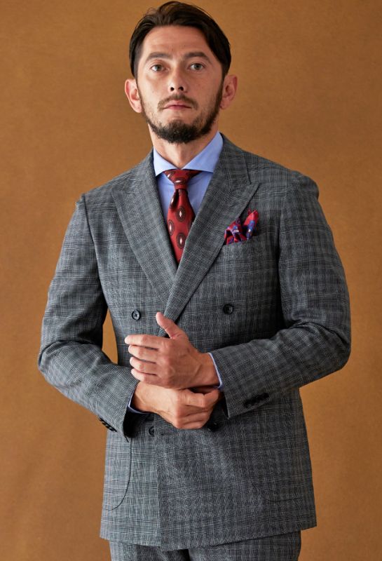 コストパフォーマンスの高さからも人気の高い「トレーニョ」で仕立てたスーツです。ライトグレーに伝統的な「グレンチェック」が入ったスタイルで、オールシーズン着用していただけます。空気を纏うような着心地を楽しむアンコンデザイン(ダブル)でジャケットを仕立てました。ボタンはブラックをチョイスし、スーツにコントラストを与え、洗練された雰囲気に。ネクタイとチーフはレッドで統一することで、大胆かつ印象的な着こなしに仕上げました。※生地在庫は変動いたしますのでご了承くださいませ。