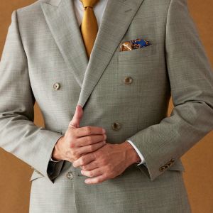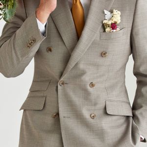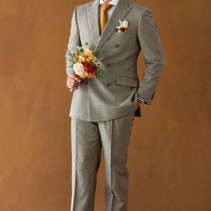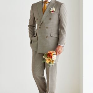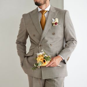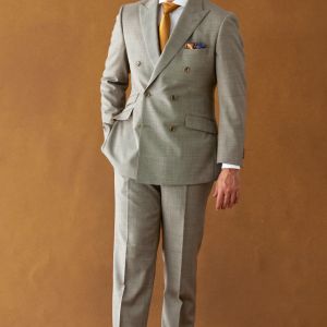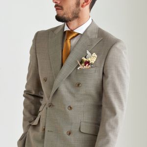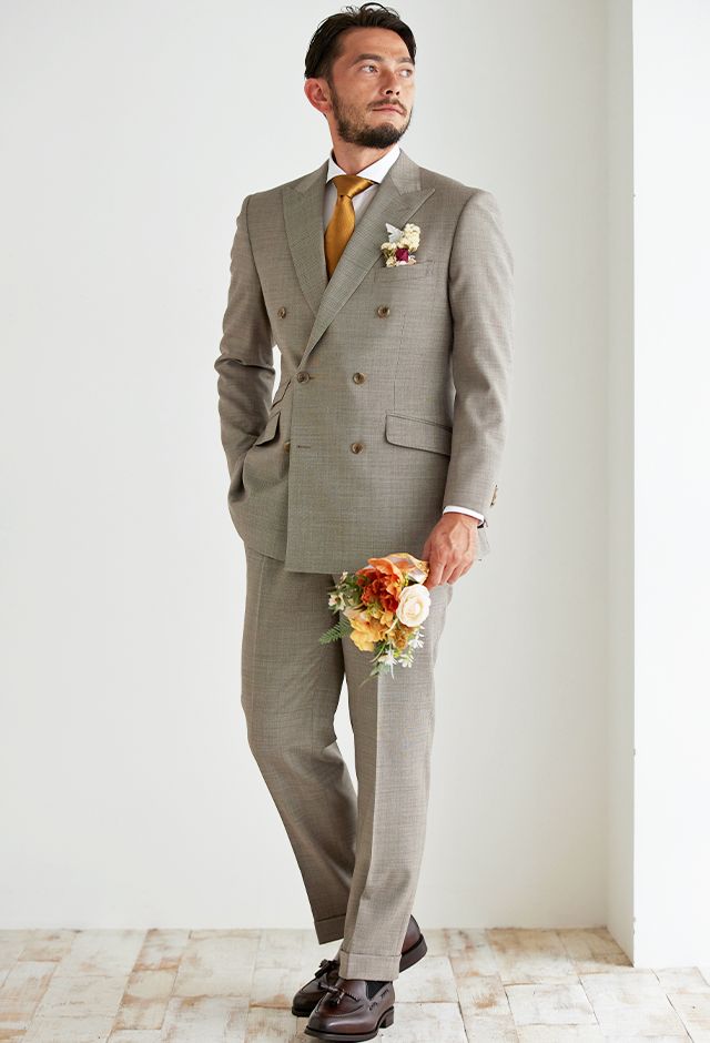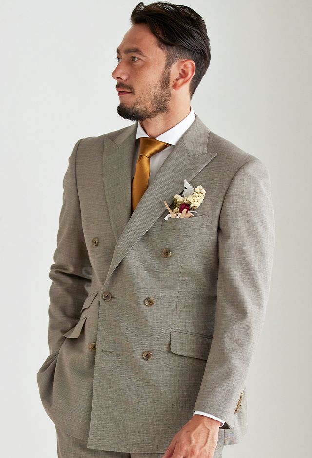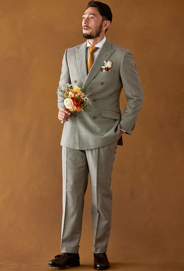 コストパフォーマンスの高さからも人気の高い「トレーニョ」で仕立てたスーツです。明るめのベージュ×サメ肌のような織のシャークスキン生地のスタイルで、オールシーズン着用していただけます。英国の”今”を感じさせるモダンブリティッシュモデル(ダブル)で仕立てました。裏地には華やかなベージュのペイズリー柄。ボタンは重ねボタンにすることで手元に立体感を持たせてくれます。ネクタイは裏地に合わせて艶のあるイエロー系をチョイス、シャツはシンプルにまとめてカジュアルウエディングの参列などにもおすすめ。※生地在庫は変動いたしますのでご了承くださいませ。