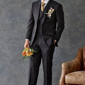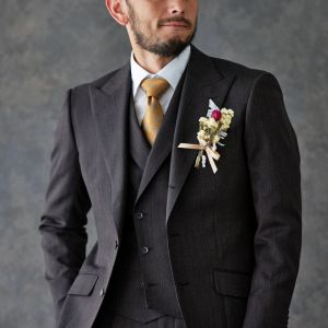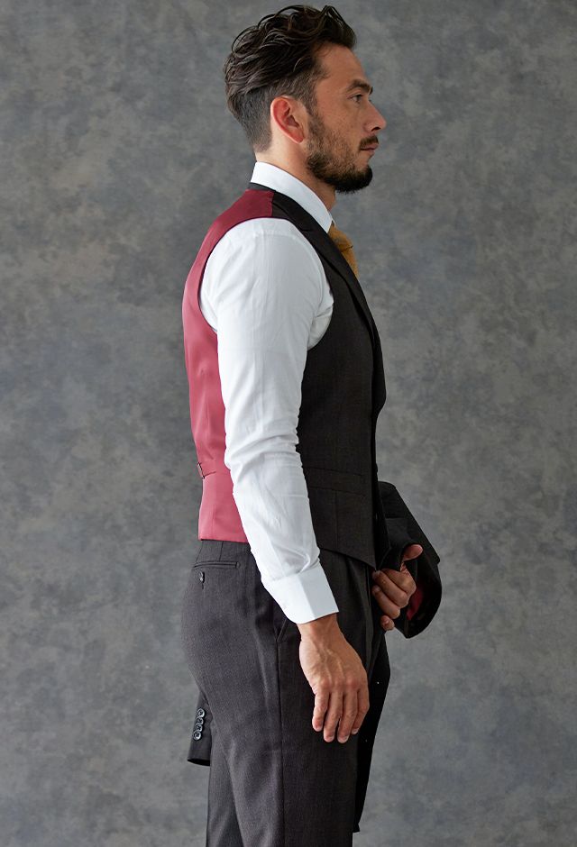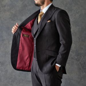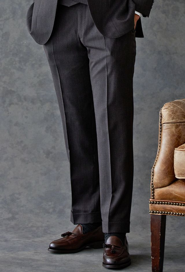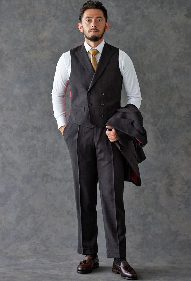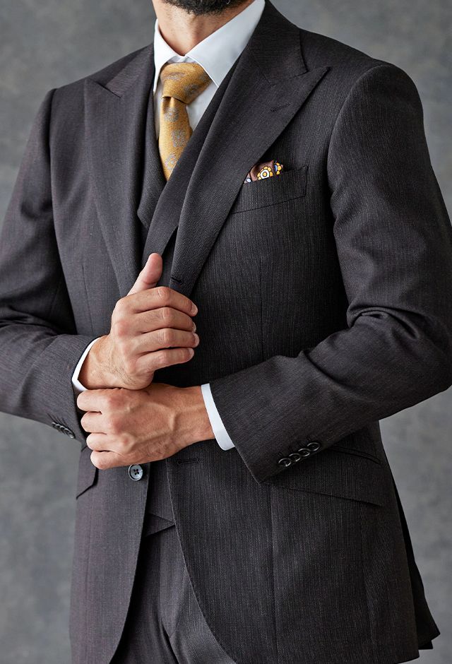 コストパフォーマンスの高さからも人気の高い「トレーニョ」で仕立てたスーツです。ジャガード織の深みのあるブラウン×無地のスタイルで、オールシーズン着用していただけます。最高峰グレードの「カイザーモデル」で極上の着心地を味わうことが出来ます。ジャケットはピークドラペル、ベストは襟付きのダブルを組み合わせた重厚感ある印象に。シンプルなシャツに明るいイエローネクタイを合わせた、フォーマルにもパーティにも活躍する着こなしに。※生地在庫は変動いたしますのでご了承くださいませ。