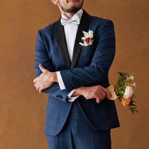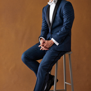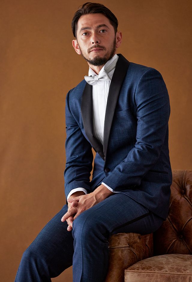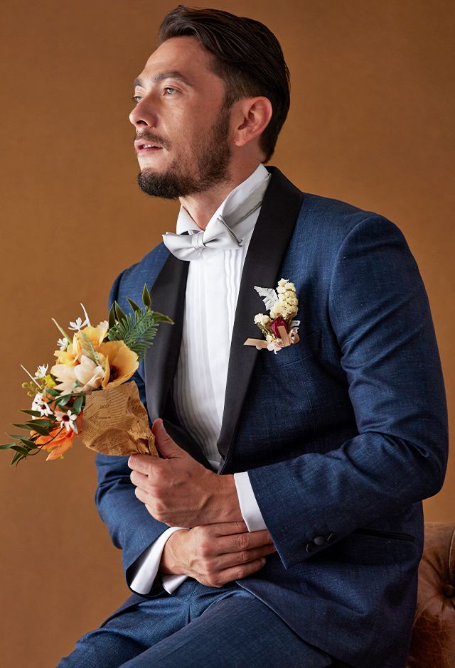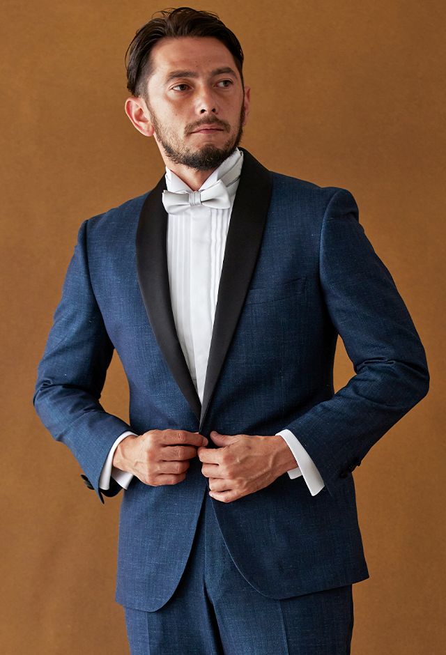 世界中のセレブリティから支持を得ているラグジュアリーブランド「ロロ・ピアーナ」で仕立てたタキシードスーツです。趣のあるブルーグリーンのスタイルで、オールシーズン着用していただけます。結婚式やパーティーなど特別な日をより華やかにするタキシードモデルで仕立てました。デニム調の生地でカジュアルウエディングにも最適。落ち着いた色合いでフラワーの色合いも映えます。シルバーの蝶ネクタイに、華やかなプリーツのウィングカラーシャツを合わせた結婚式・パーティーに最適なコーデ。※生地在庫は変動いたしますのでご了承くださいませ。