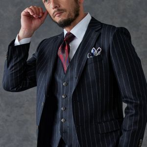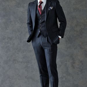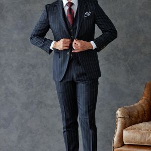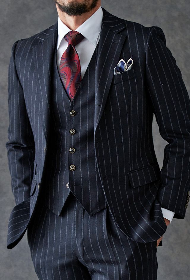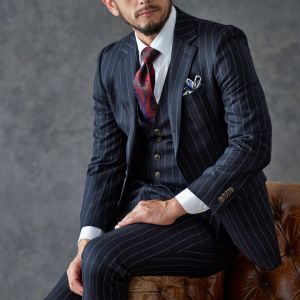 80ケ国以上にファンを持つ世界的なイギリスブランド「ドーメル」で仕立てたスーツです。ブラックの生地に入ったピッチの広いチョークストライプが大人の余裕を醸し出すスタイルで、秋冬シーズンの生地になります。クラシックな部分とセクシーさを融合したモダンクラシックモデルで仕立てました。焼き水牛のボタンがスーツのかすんだストライプ柄と調和し、柔らかな印象に。レッドとネイビーのネクタイに、スーツと同系色のローファーを合わせた気品のある着こなしに仕上げました。※生地在庫は変動いたしますのでご了承くださいませ。