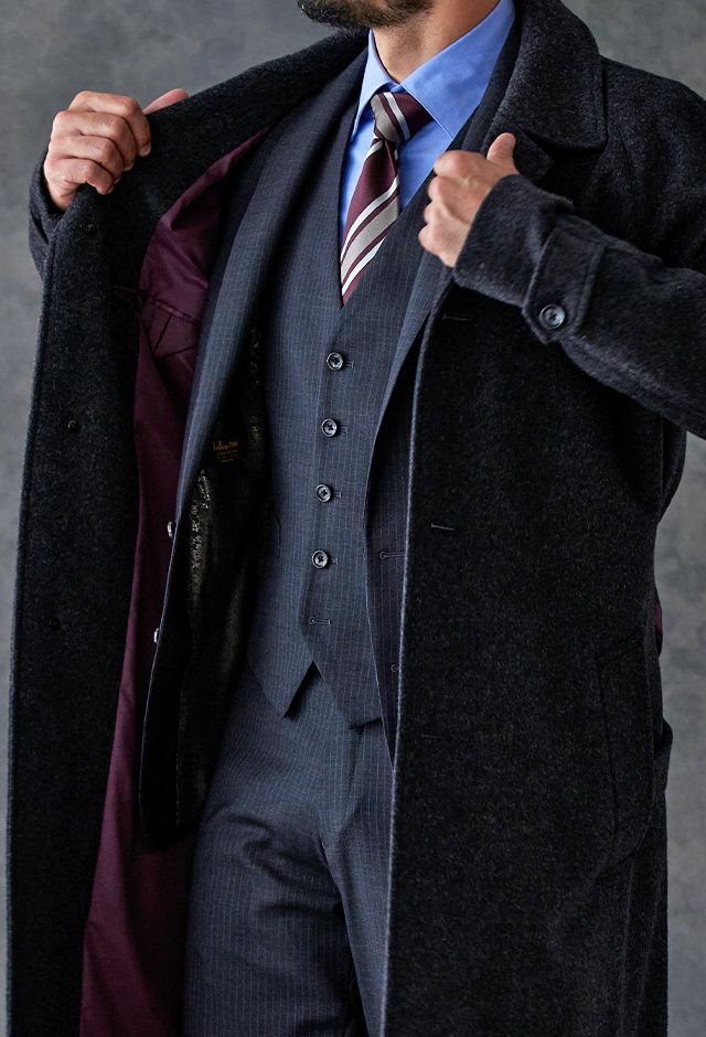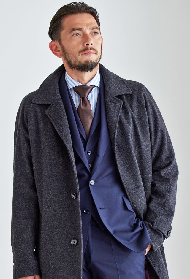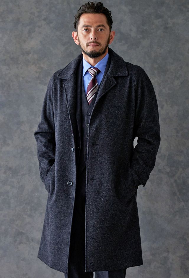 グローバルスタイルがセレクトした生地コレクションで仕立てたコートです。温かみのあるチャコールグレーと定番の無地をあわせたシンプルスタイルで、トレンドに左右されにくく、長く愛用できるトラディショナルなステンカラーコートに仕立てました。腕が動かしやすく、ナチュラルなショルダーラインが美しいラグランスリーブでオン・オフ問わず着用できる仕上げました。ネイビーのスーツに合わせて若々しくも落ち着きある雰囲気に。チャコールグレーのスーツに合わせてよりシックで大人な印象をプラスしました。