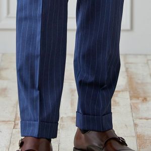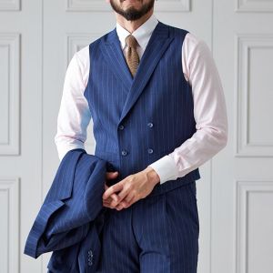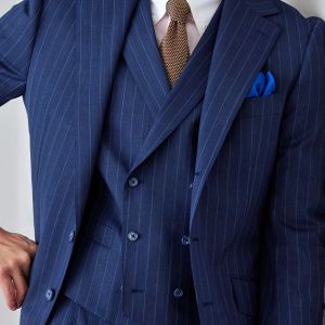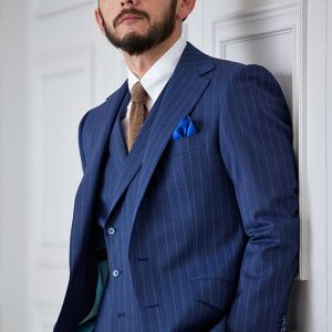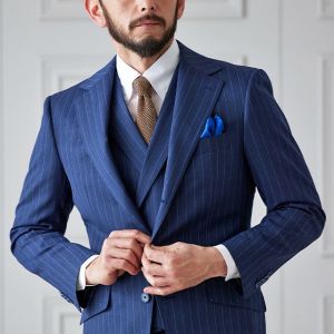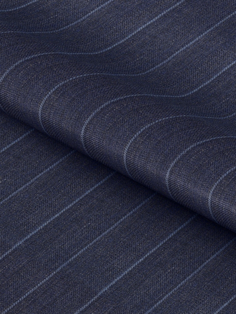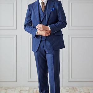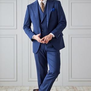 イタリアのノウハウを採用し、コストパフォーマンスに優れた「ビエラフィニッシュ」で仕立てたスーツです。ブルー寄りのブルーグレーに程よく印象的なストライプ柄のスタイルで、オールシーズン着用していただけます。クラシックな部分とセクシーさを融合したモダンクラシックモデルで仕立てました。クラシカルなスーツに、ボタン・裏地を同系色でまとめた爽やかな印象に。春夏らしいニットタイとスーツと同系色のチーフを合わせた程よく抜け感のあるコーデです。