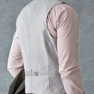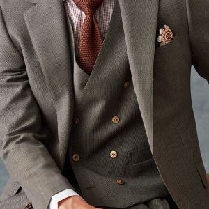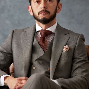 トレンドをふんだんに取り入れたデザイン性が特徴の「マルゾット」で仕立てたスーツです。ベージュカラーに立体感のあるバーズアイ柄のスタイルで、オールシーズン着用していただけます。クラシックな部分とセクシーさを融合したモダンクラシックモデルで仕立てました。チェンジポケット付きでスタイリングのアクセントに。ダブルブレストのベストはエレガントな装いになります。チェック柄のクレリックシャツとニットタイを合わせた柔らかくも品のあるコーデに仕上げました。