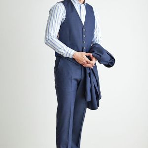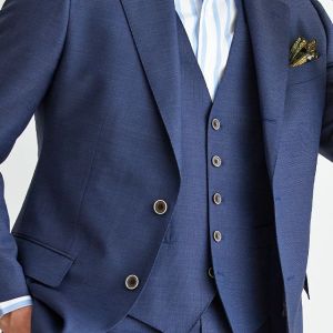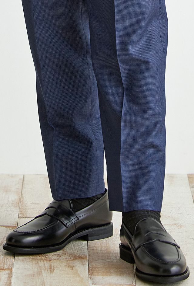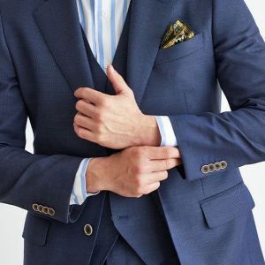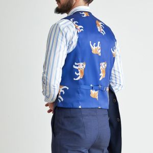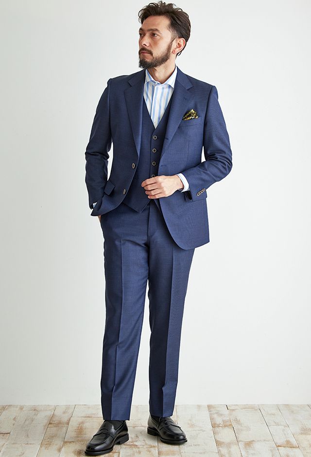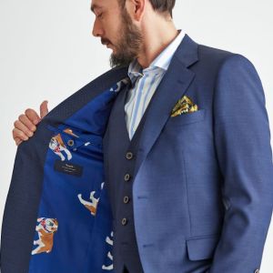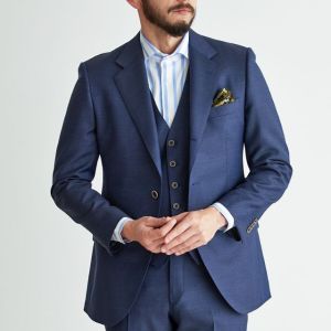トレンドをふんだんに取り入れたデザイン性が特徴の「マルゾット」で仕立てたスーツです。ネイビーカラーに立体感のあるバーズアイ柄のスタイルで、オールシーズン着用していただけます。人気の英国系モデル・モダンブリティッシュモデルで仕立てました。裏地には可愛らしく存在感がある、ブルー×犬柄を取り入れました。スーツのカラーに合わせたピッチが広いブルーのストライプシャツに、ボタンとリンクしたチーフを取り入れた統一感のあるコーデです。