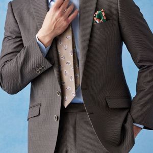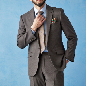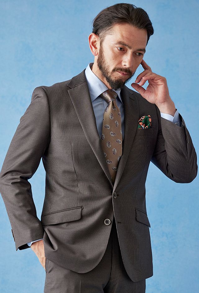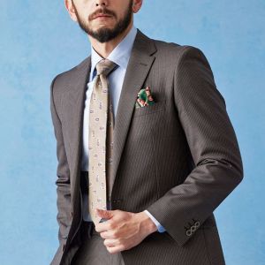 トレンドをふんだんに取り入れたデザイン性が特徴の「マルゾット」で仕立てたスーツです。ブラウンをベースに、同系色のピンストライプを配したスタイルで、オールシーズン着用していただけます。モードな空気感を醸し出すことが出来るスリムフィットモデルでお仕立てしました。ふちに加工が施された高級感あるボタンと、スタイリッシュなスラント(斜め)ポケットを採用アースカラーと相性の良い寒色系のシャツに、グリーンで統一された小物を合わせた「ヴェルデ・エ・マローネ」(緑×茶)コーデ。
