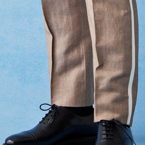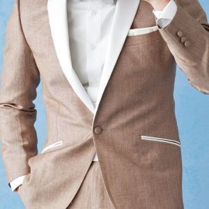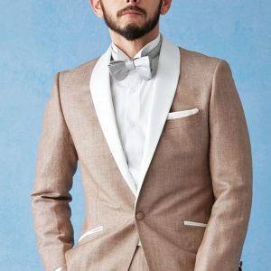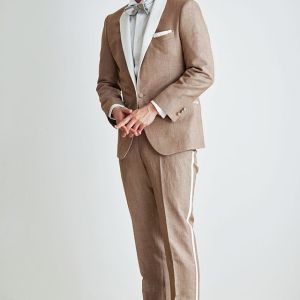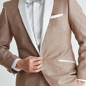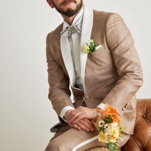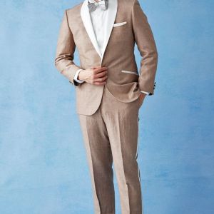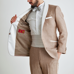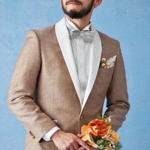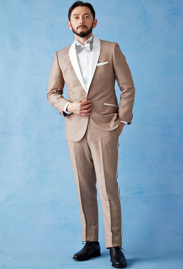 フランネルの創設者として公認されているイギリスの高級ブランド「フォックスブラザーズ」で仕立てたスーツです。リネン(麻)混の涼し気な手触りのベージュカラーのスタイルで、春夏シーズンの生地になります。結婚式やパーティーなど特別な日をより華やかにするタキシードモデルで仕立てました。タキシードの基本は押さえつつ、スラント(斜め)ポケット、拝絹にホワイトを配したオーダーならではの仕様。タキシードのトーンに合わせて、小物はシルバーで統一し、カジュアルウエディングやパーティーシーンに活躍するコーデに仕上げました。