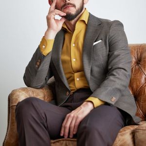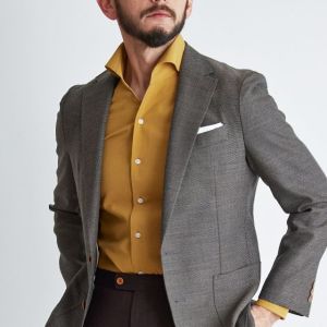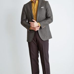 高品質でコストパフォーマンスに優れたイタリアブランド「カノニコ」で仕立てたスーツです。霜降りの様な表情のあるブラウン×無地のスタイルで、春夏シーズンの生地になります。肩パットや芯地を極力排したアンコンモデルでジャケットを仕立てました。ベーシックな2ボタンジャケットに光沢が美しい貝ボタンを誂えて、静かな高級感を演出。深みのあるマスタードカラーの開襟シャツと赤系のスラックスを合わせたレトロモダンコーデです。