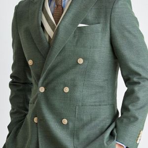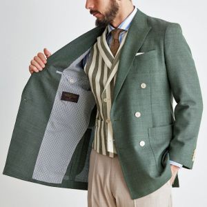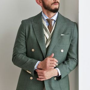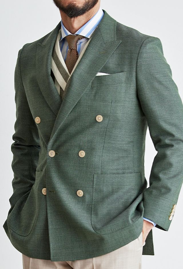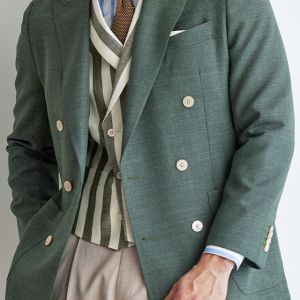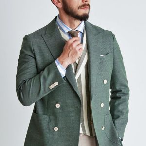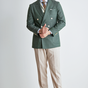 高品質でコストパフォーマンスに優れたイタリアブランド「カノニコ」で仕立てたスーツです。織りが美しいグリーンの無地で、春夏シーズンの生地になります。空気を纏うような着心地を楽しむアンコンモデル(ダブル)でジャケットを仕立てました。煌びやかな貝ボタンと、大きく内側に入ったステッチがカジュアルさをより強調し柔らかい印象のダブルジャケットに。薄い印象になりがちなアースカラーの上下に、特徴的な襟付きのラペルドベストを合わせたメリハリのあるコーデです。