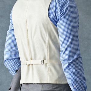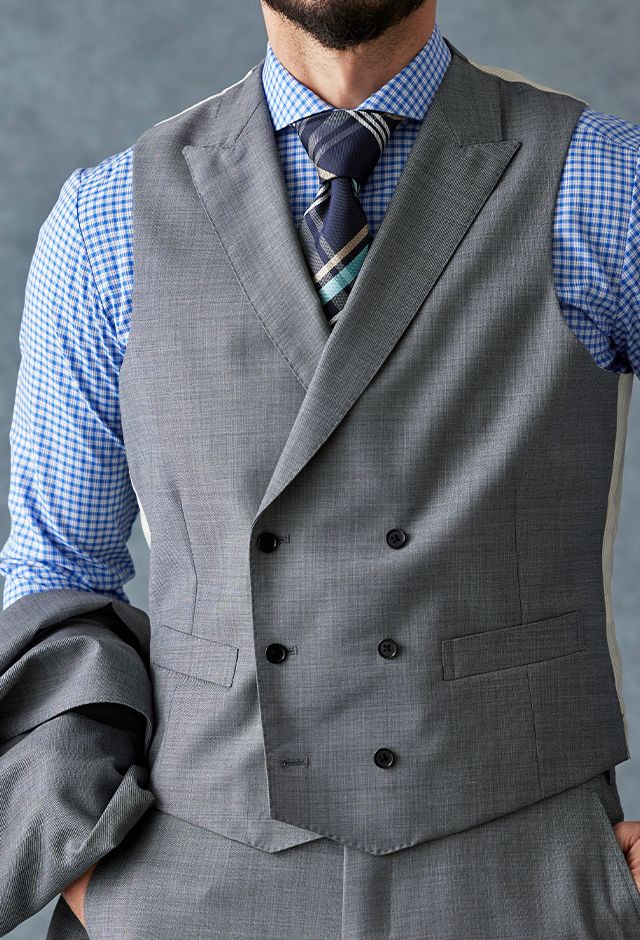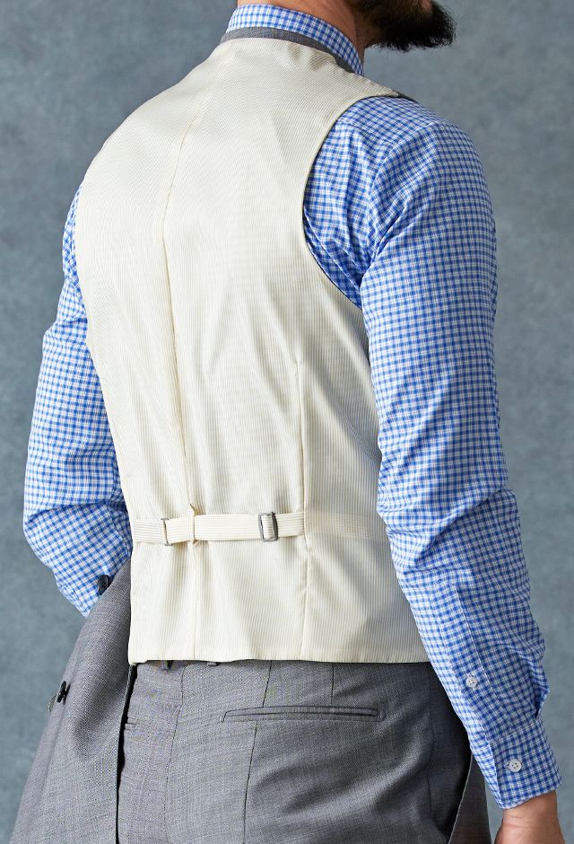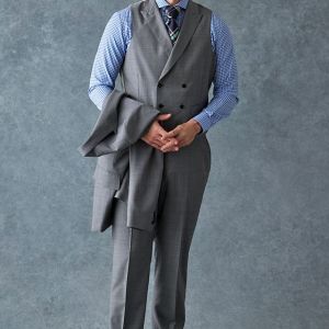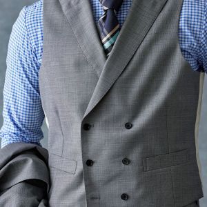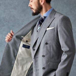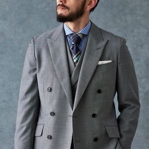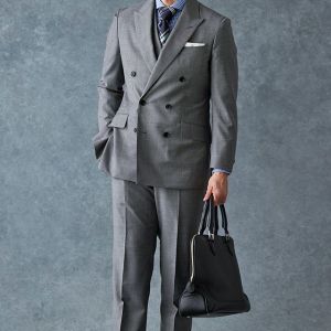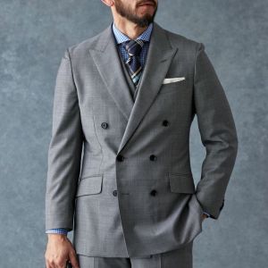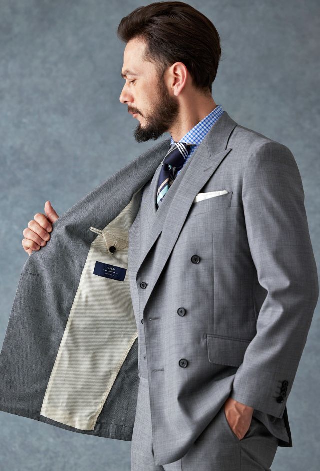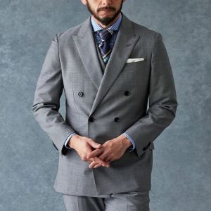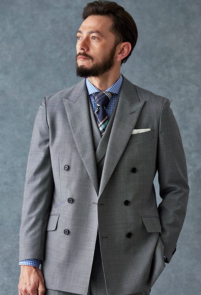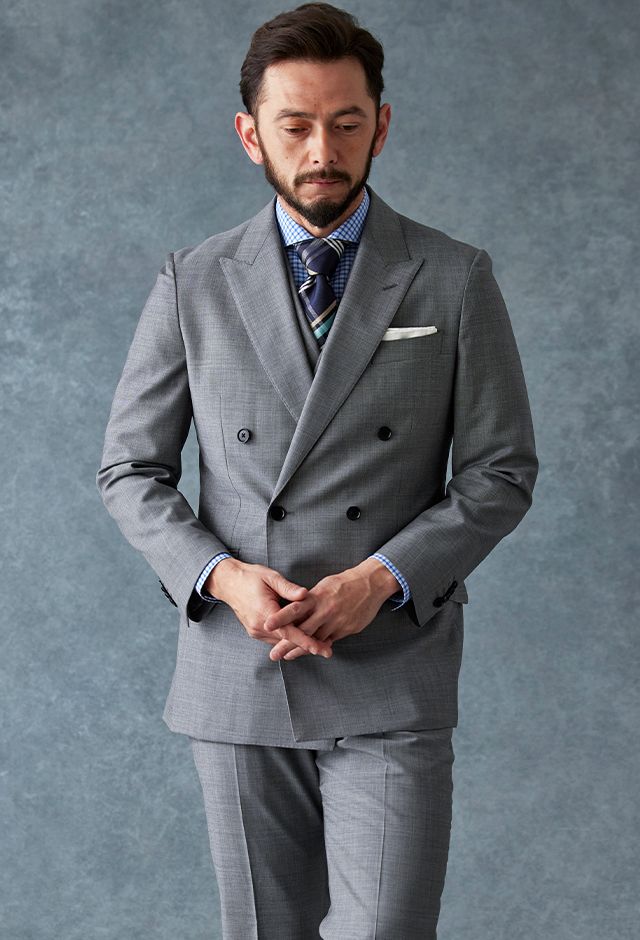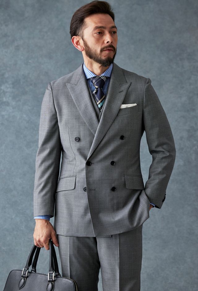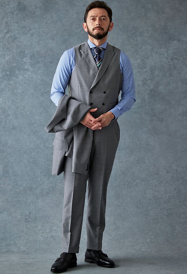トレンドをふんだんに取り入れたデザイン性が特徴の「マルゾット」で仕立てたスーツです。大人の色気を醸し出すミディアムグレー×無地のスタイルで、オールシーズン着用していただけます。肩パットや芯地を極力排したアンコンモデルでジャケットを仕立てました。ダブルスーツには珍しいベストを付けたスリーピーススーツ。裏地には繊細なライトベージュカラーのストライプ柄をチョイス。シャツとネクタイは大きさの違うチェック柄を組み合わせ、上品さと存在感あるコーデに仕上げました。