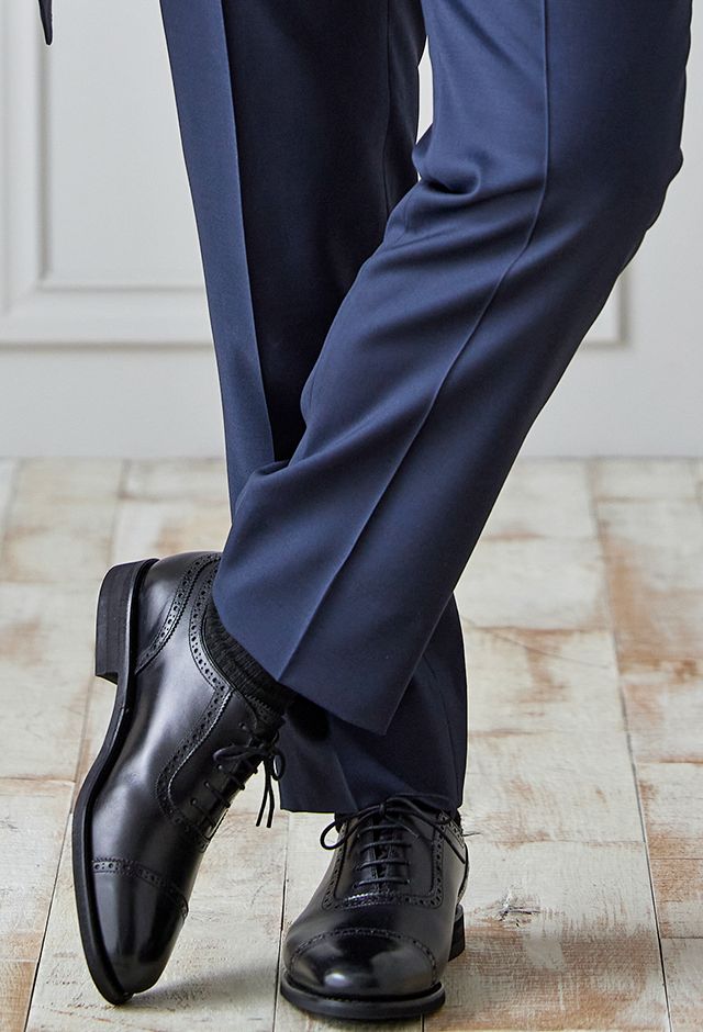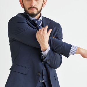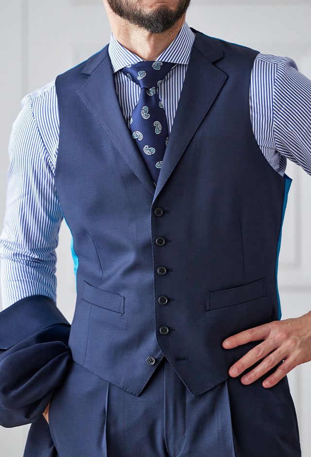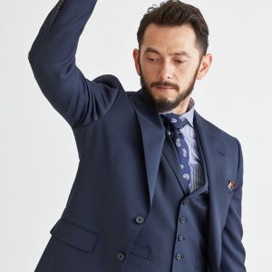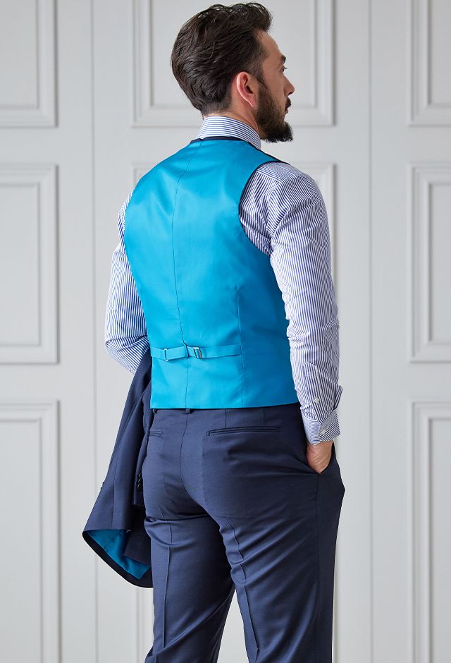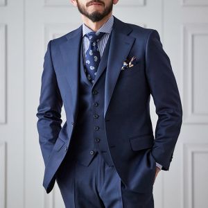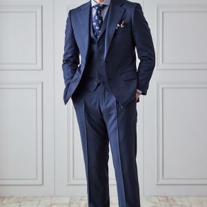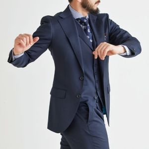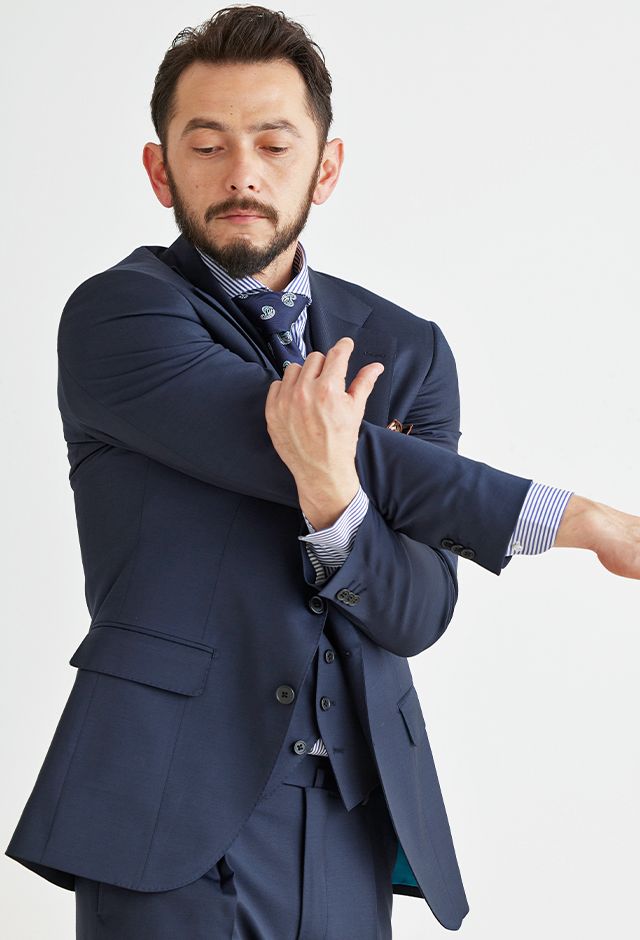 ストレッチ性の高い生地が大好評のイタリアブランド「トラバルド・トーニャ」で仕立てたスーツです。発色と艶感の美しいブルー系ネイビー×無地のスタイルで、オールシーズン着用していただけます。最高峰グレードの「カイザーモデル」で極上の着心地を味わうことが出来ます。鮮やかなブルーの裏地と、艶のあるブラックボタンでスーツの上質さを際立たたせました。小物は柄×柄の組み合わせでも、ベースカラーを統一することでまとまりのあるコーデに。