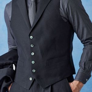 80ケ国以上にファンを持つ世界的なイギリスブランド「ドーメル」で仕立てたスーツです。大人の色気を醸し出すミディアムグレー×無地のスタイルで、春夏シーズンの生地になります。最高峰グレードの「カイザーモデル」で極上の着心地を味わうことが出来ます。襟付きのラペルドベストとベントデザインを排したフォーマルなデザイン。オールブラックで統一されたコーデも、デニム調のブラックシャツとグレーのニットタイで、重くなりすぎないモダンな着こなし。