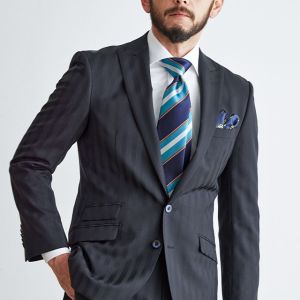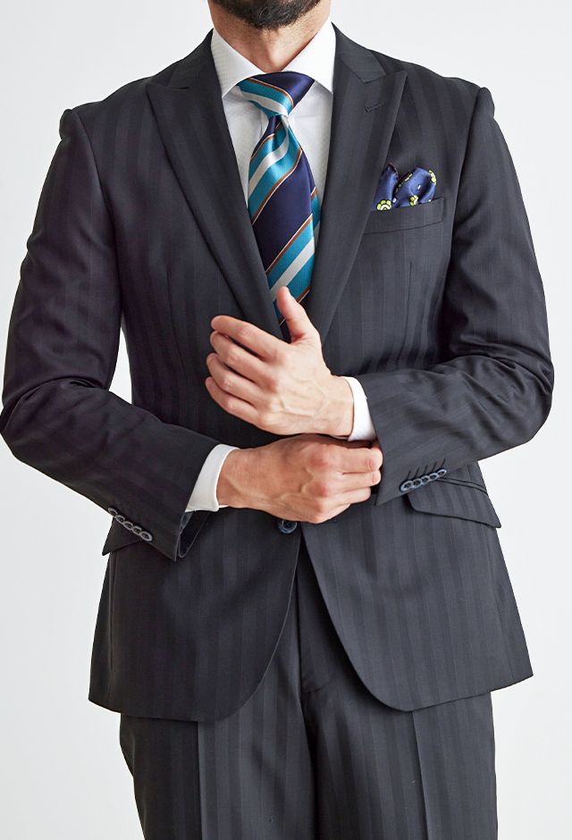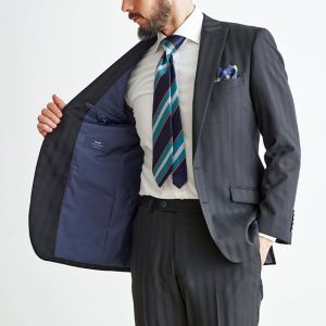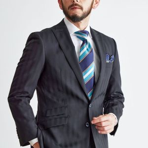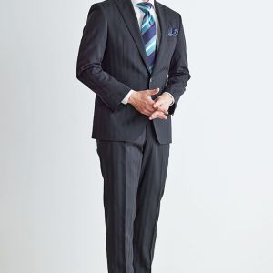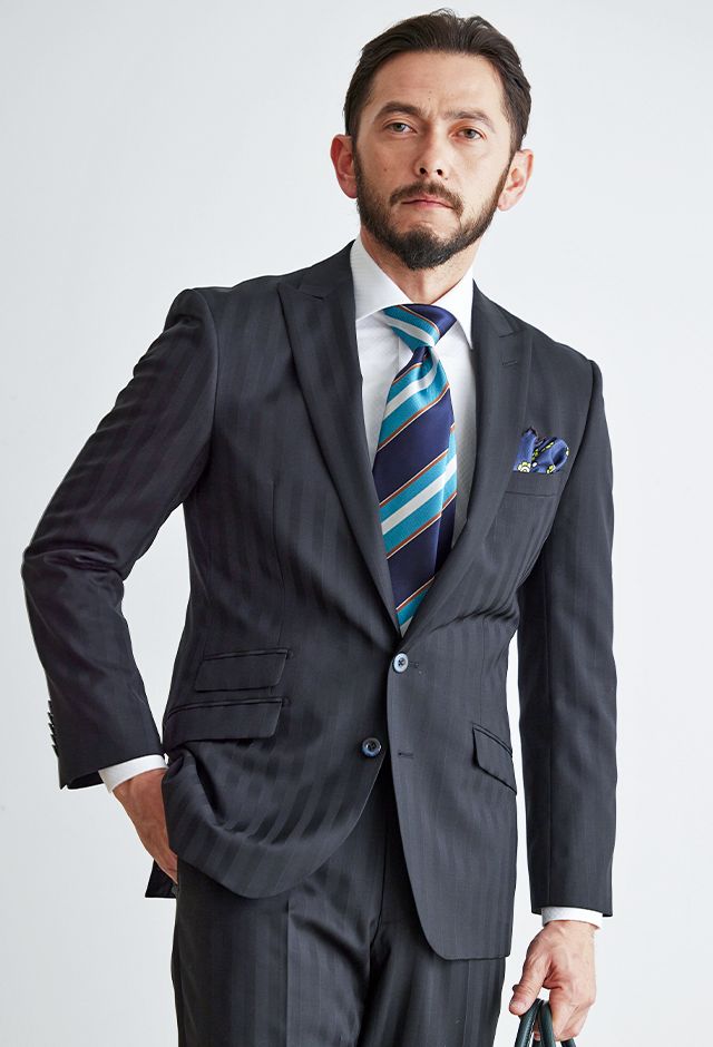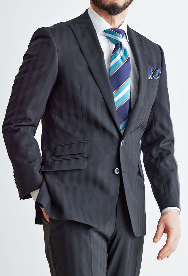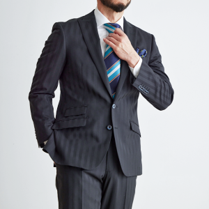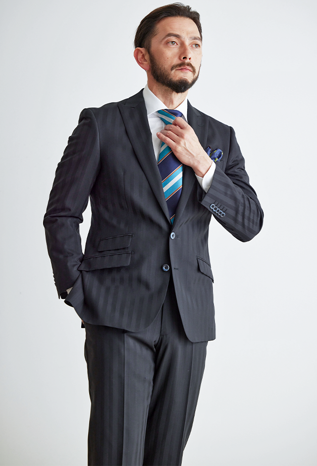 トレンドをふんだんに取り入れたデザイン性が特徴の「マルゾット」で仕立てたスーツです。ブラックの生地に入った印象的なストライプが大人の雰囲気を醸し出すスタイルで、オールシーズン着用していただけます。モードな空気感を醸し出すことが出来るスリムフィットモデルでお仕立てしました。スラント(斜め)チェンジポケットが付いた英国風のディテールに、黒と相性の良いマーブル調のブルーボタンをチョイス。ネクタイ・チーフをボタンの色とリンクさせた、重くなりすぎないまとまりのあるコーデです。