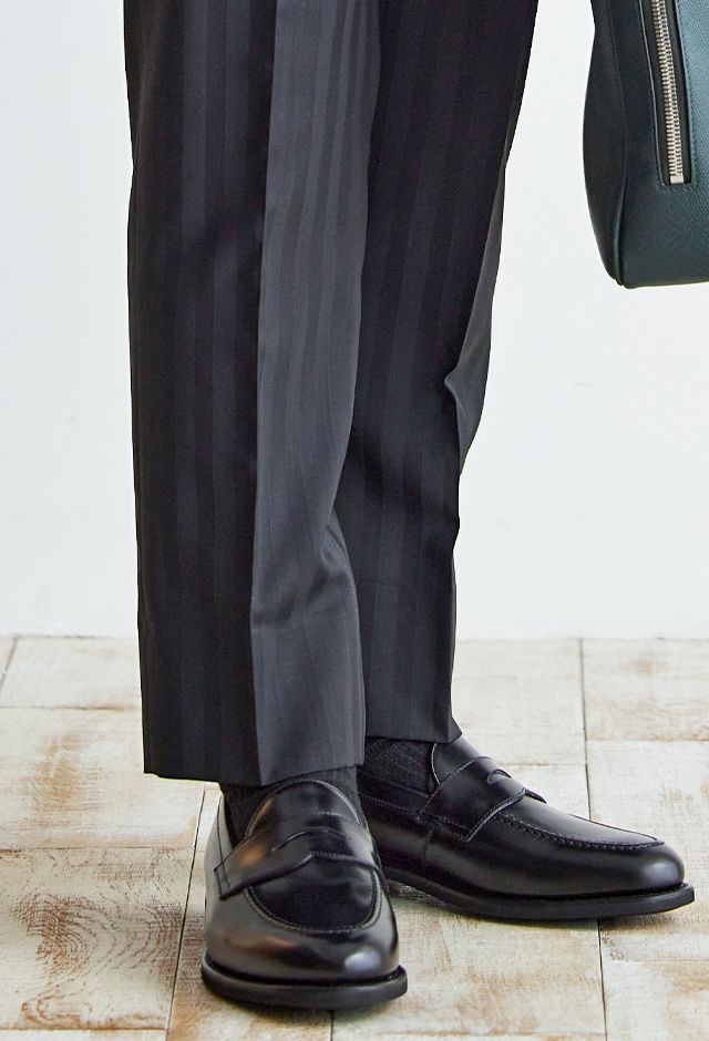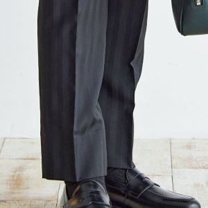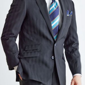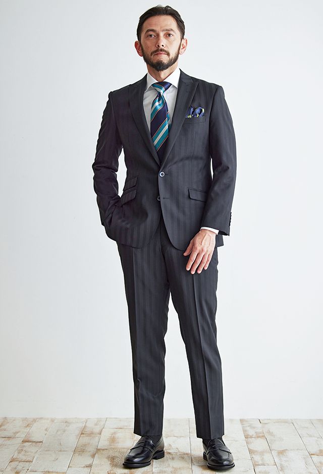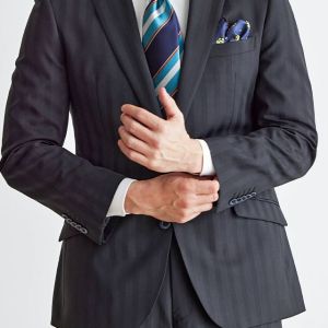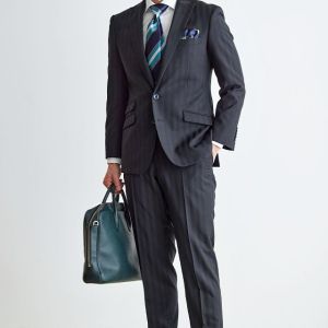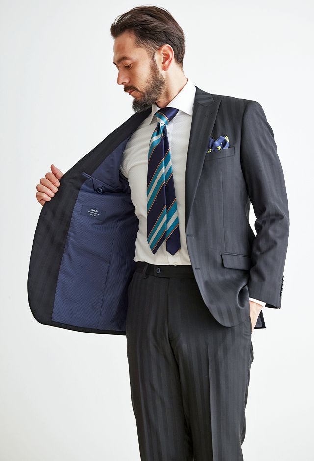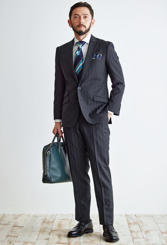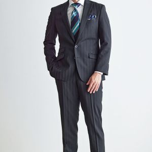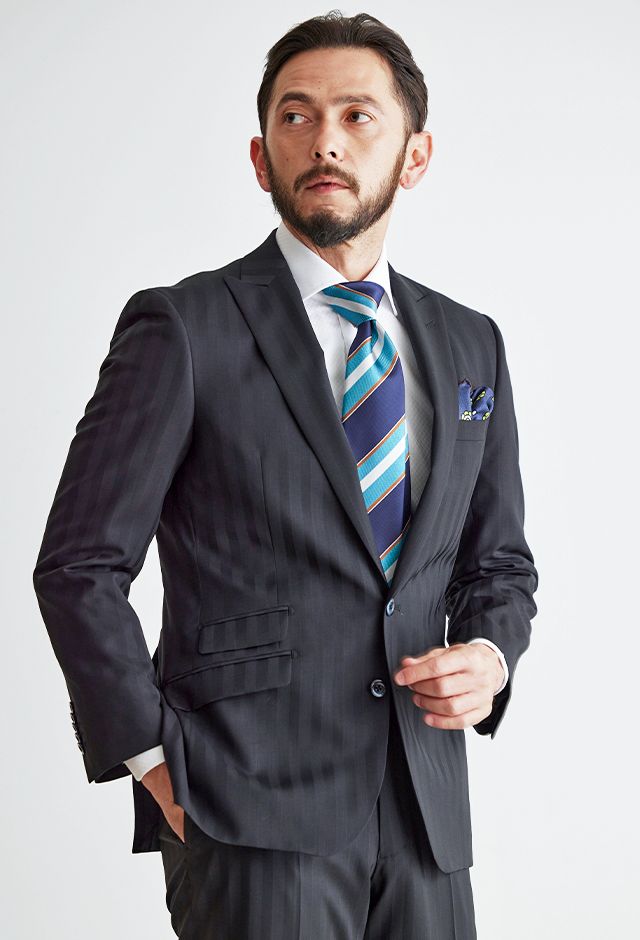 トレンドをふんだんに取り入れたデザイン性が特徴の「マルゾット」で仕立てたスーツです。ブラックの生地に入った印象的なストライプが大人の雰囲気を醸し出すスタイルで、オールシーズン着用していただけます。モードな空気感を醸し出すことが出来るスリムフィットモデルでお仕立てしました。スラント(斜め)チェンジポケットが付いた英国風のディテールに、黒と相性の良いマーブル調のブルーボタンをチョイス。ネクタイ・チーフをボタンの色とリンクさせた、重くなりすぎないまとまりのあるコーデです。