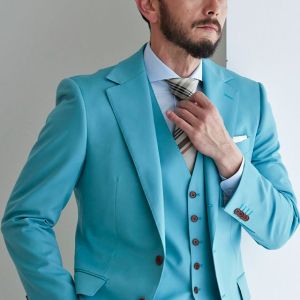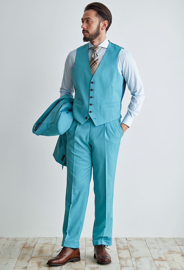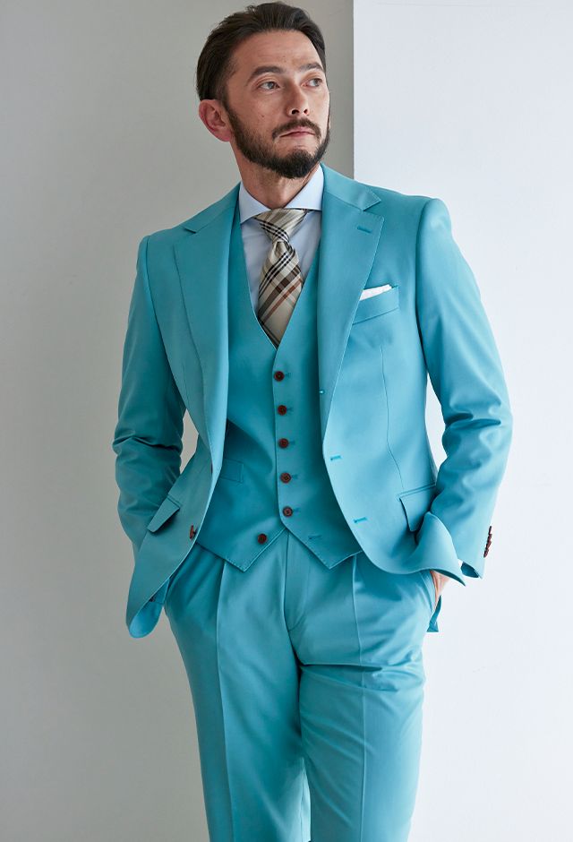 高品質でコストパフォーマンスに優れたイタリアブランド「カノニコ」で仕立てたスーツです。青みがかった明るめなグリーン無地のスタイルで、オールシーズン着用していただけます。クラシックな部分とセクシーさを融合したモダンクラシックモデルで仕立てました。パンツのウエストにはワンタック仕様をチョイスして、クラシカルな印象に。ナットボタンで細部も上質な仕上がり。シャツはグリーンに馴染みやすいブルー系を、ネクタイはチェック柄のベージュカラーを合わせて若々しく清潔感溢れるコーデに。