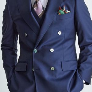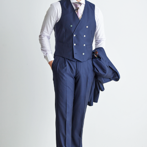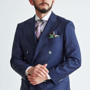 イタリアの高級生地ブランド「クロス エルメネジルド ゼニア」で仕立てたスーツです。発色の美しいネイビーと上品なヘリンボーンストライプを組み合わせたスタイルで、春夏シーズンの生地になります。クラシックな部分とセクシーさを融合したモダンクラシックモデルで仕立てました。ダブルスーツには珍しいベストを付けたスリーピーススーツ。艶やかなネイビーに映える貝ボタンが高級感を演出。存在感のあるスーツスタイルに、白シャツとレジメンタルタイでまとめた王道コーデ。