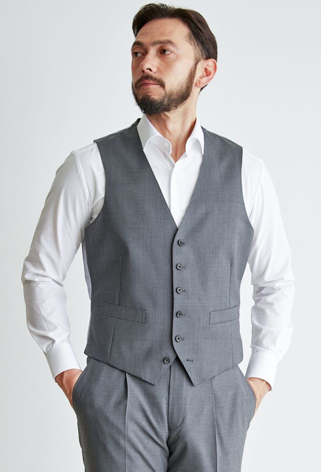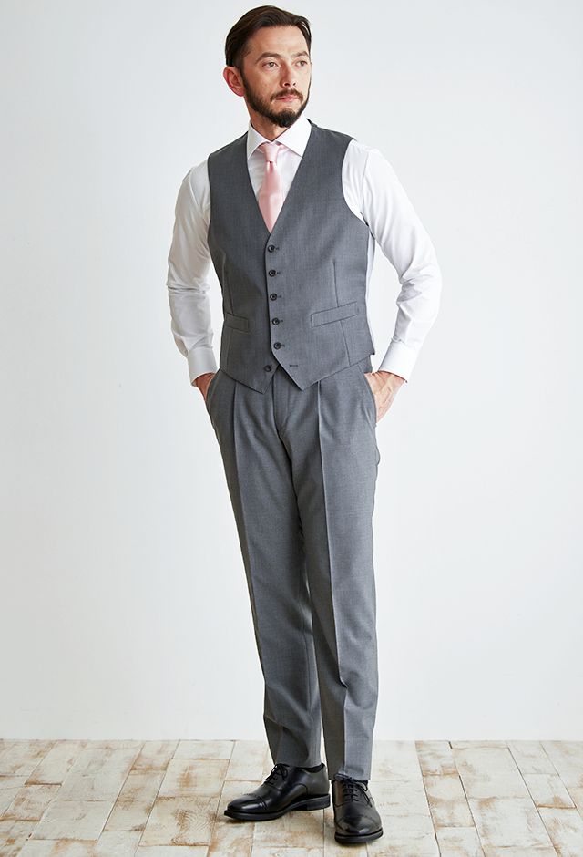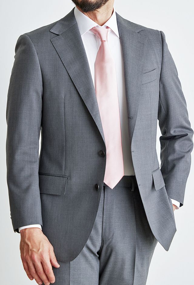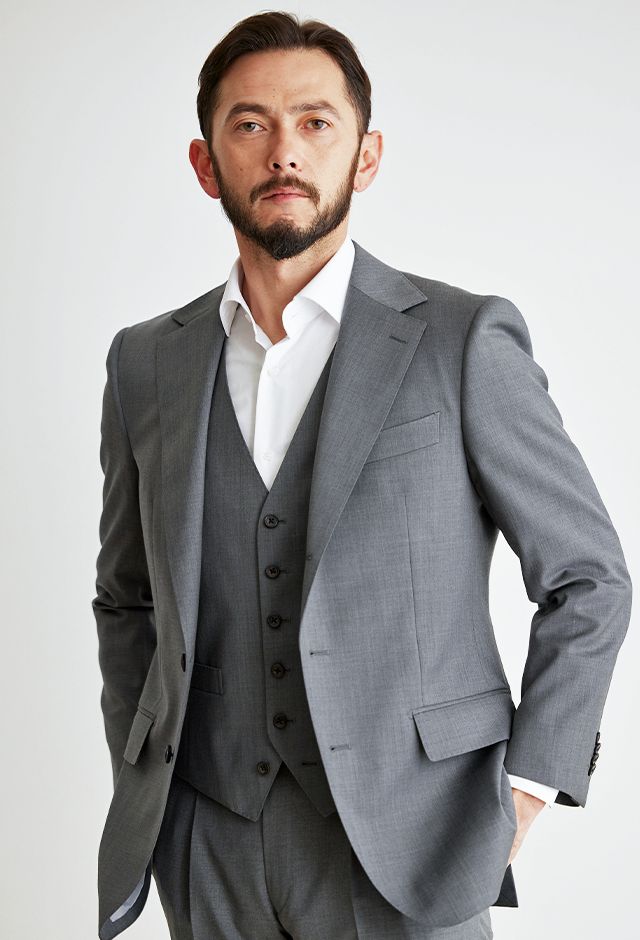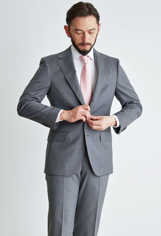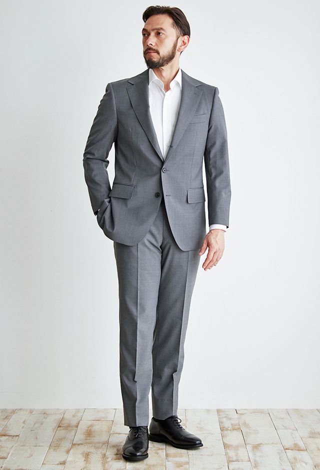 トレンドをふんだんに取り入れたデザイン性が特徴の「マルゾット」で仕立てたスーツです。落ち着きと上品さのあるミディアムグレーのスタイルで、オールシーズン着用していただけます。クラシックな部分とセクシーさを融合したモダンクラシックモデルで仕立てました。裏地は同系色のグレーで統一感をプラスしました。主張しすぎないセミブローグのシューズ、TVフォールドでいれた白のチーフと白のワイシャツがかっちりとした印象を持たせるコーデです。