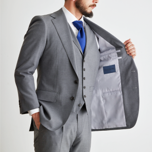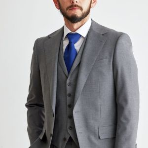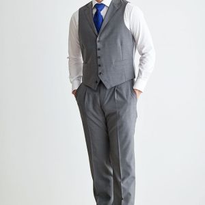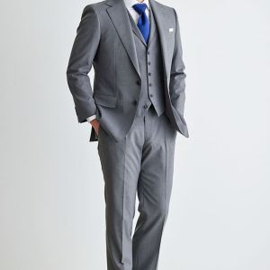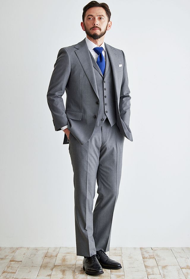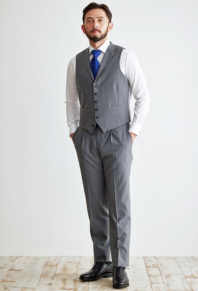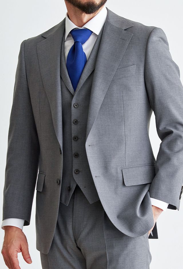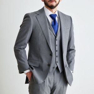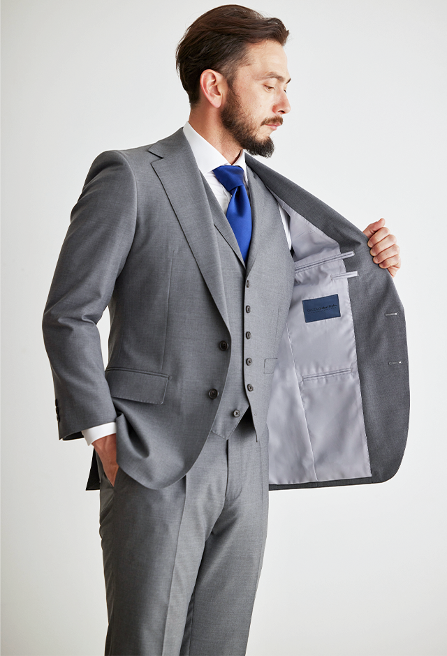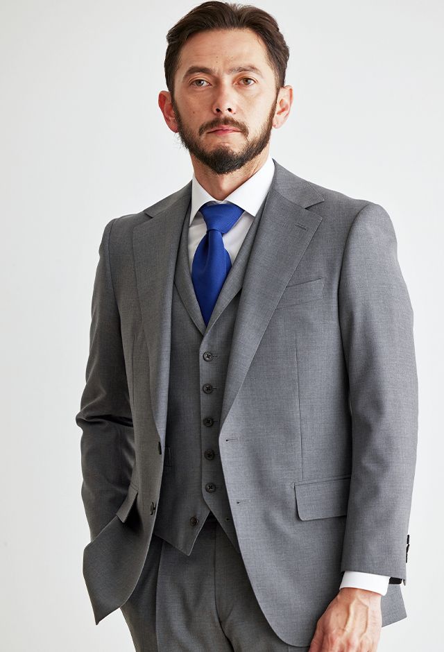耐久性とコストパフォーマンスに優れた「テクニカル・ウーステッド」で仕立てたスーツです。マットな質感のミディアムグレーと定番の無地のスタイルで、オールシーズン着用していただけます。クラシックな部分とセクシーさを融合したモダンクラシックモデルで仕立てました。ラペルドベストもセットのスリーピースでフォーマル感や重厚感をプラス。白シャツ、ネイビータイであらゆるビジネスシーンに対応したお手本のような着こなし。
