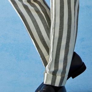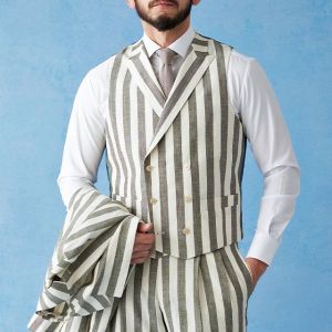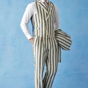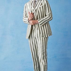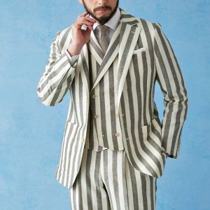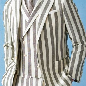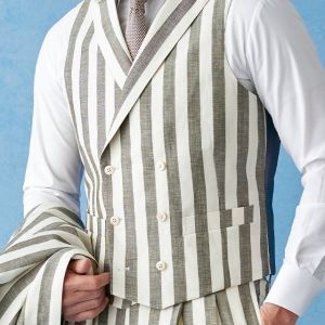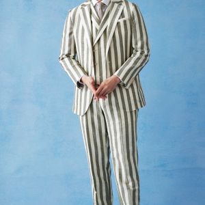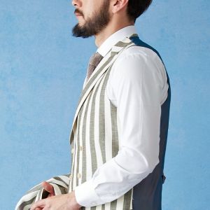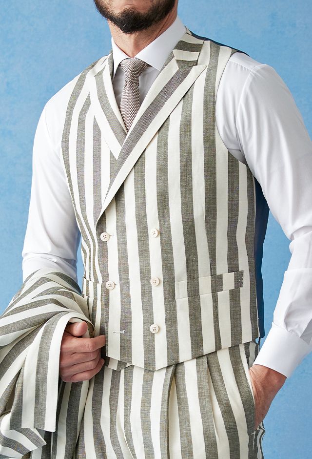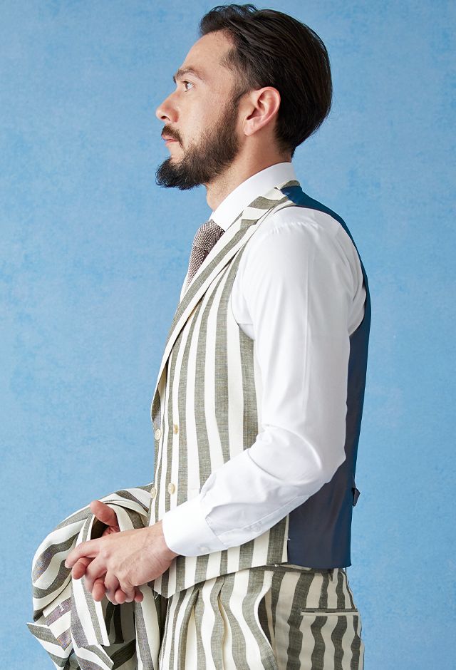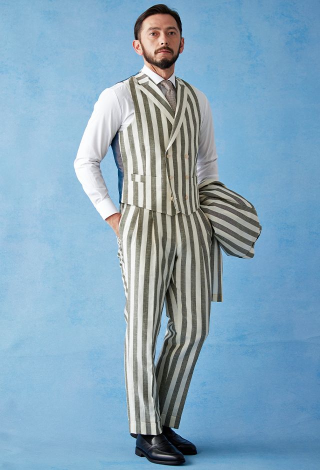 フランネルの創設者として公認されているイギリスの高級ブランド「フォックスブラザーズ」で仕立てたスーツです。お洒落な仕上がりになるホワイトカラー×幅広のストライプ柄のスタイルで、春夏シーズンの生地になります。肩パットや芯地を極力排したアンコンモデルでジャケットを仕立てました。カジュアルな印象の中に、襟付きのダブルラペルドベストと、ツータックのスラックスでクラシック感をプラス。インパクトのあるスーツには白シャツ・無地のニットタイを合わせたシンプルながら季節感のある着こなし。