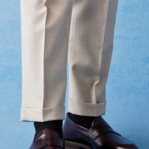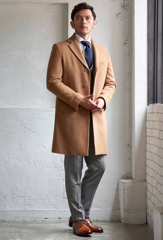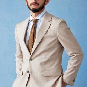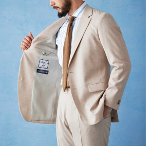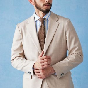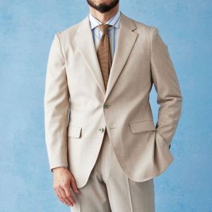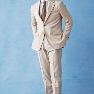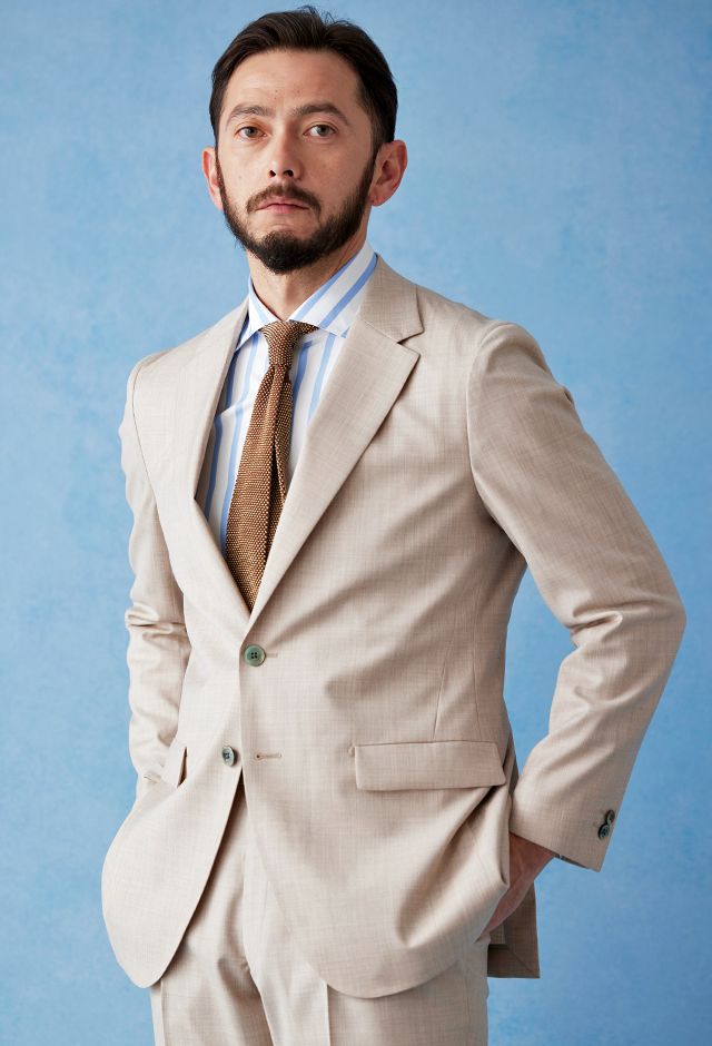 ストレッチ性の高い生地が大好評のイタリアブランド「トラバルド・トーニャ」で仕立てたスーツです。トレンドのベージュカラーとさらっとした素材の無地スタイルで、春夏シーズンの生地になります。オーダースーツ専門店が仕立てる、「Y.E」モデルで仕立てました。上品な光沢で人気の貝ボタンと、裾口のダブル幅が狭いスタイリッシュなベルトレスパンツで軽快な印象に。Vゾーンは春夏らしいカラーでまとめ、足元のダークトーンのローファーで全体を締めたお手本コーデです。