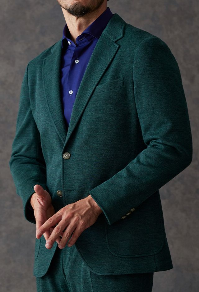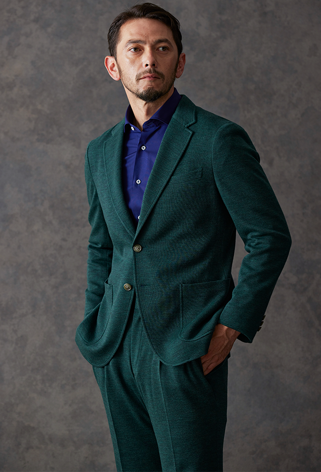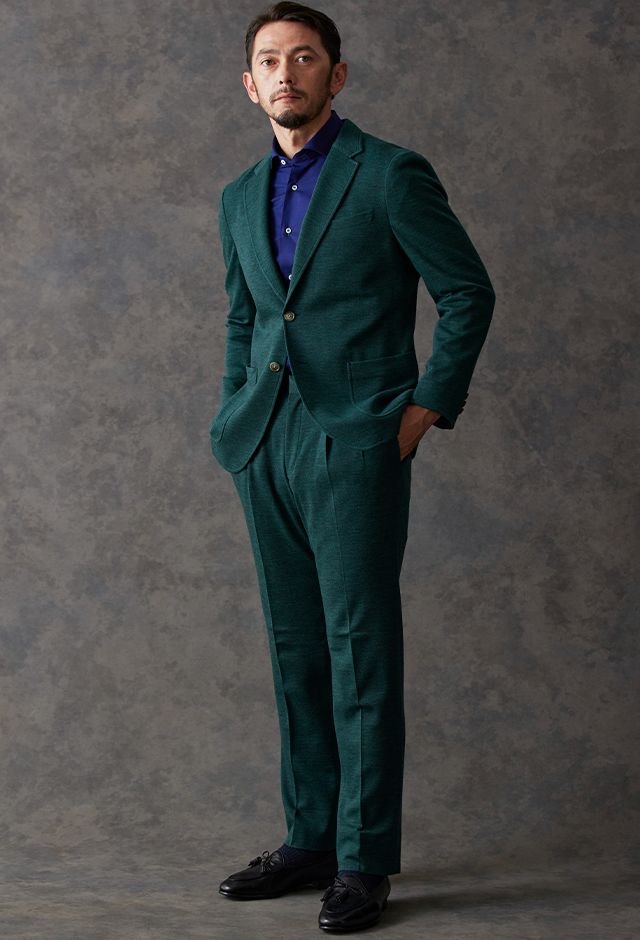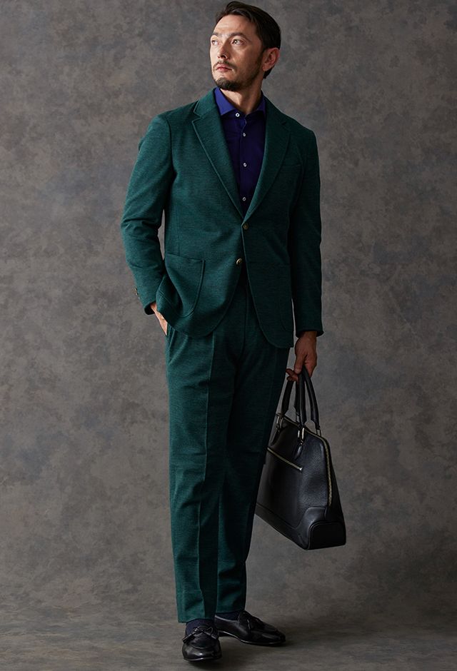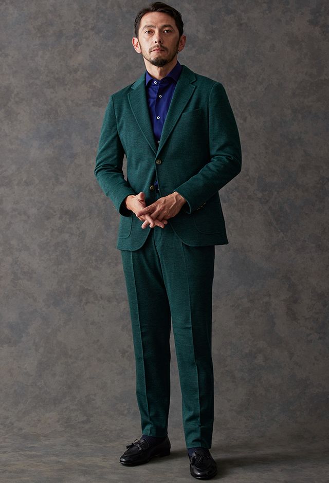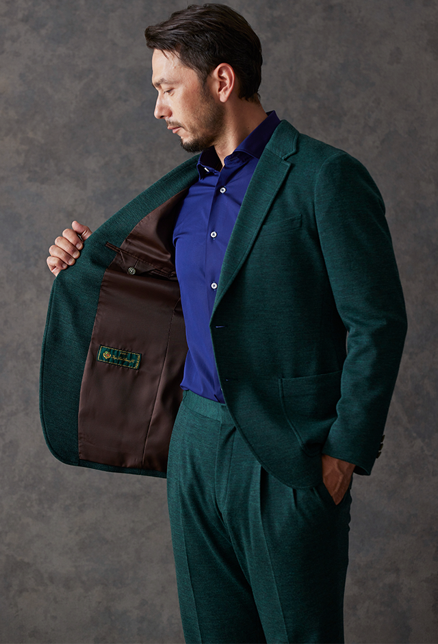 世界中のセレブリティから支持を得ているラグジュアリーブランド「ロロ・ピアーナ」で仕立てたスーツです。流行りのグリーンをベースに伸縮率が高く動きやすいニット調のスタイルで、秋冬シーズンの生地になります。カジュアルな雰囲気のアンコンモデルで軽快に仕立てました。ジャケットは同系色系の2つボタン仕様でスポーティーな印象に。裏地はブラウン系で表地との統一感を意識したチョイス。足元はシングルの裾でスッキリとした印象に。濃いめのネイビーシャツと合わせてよりカジュアル感を出しました。