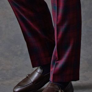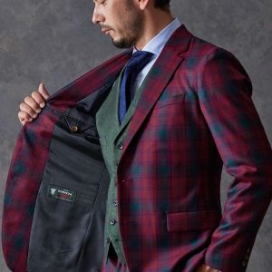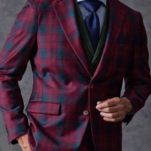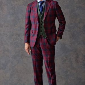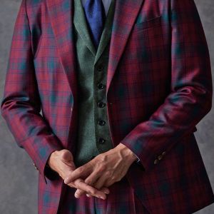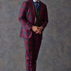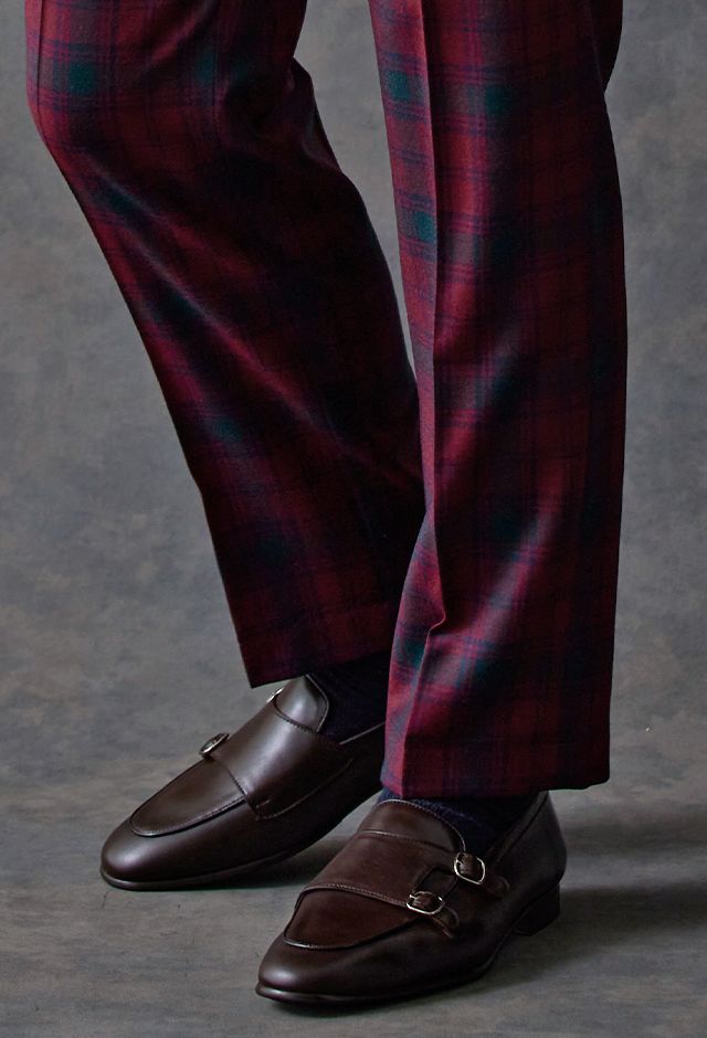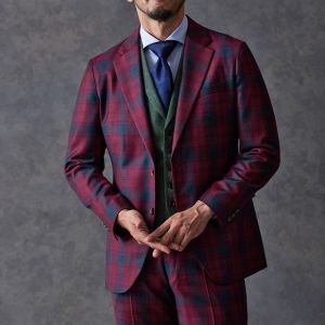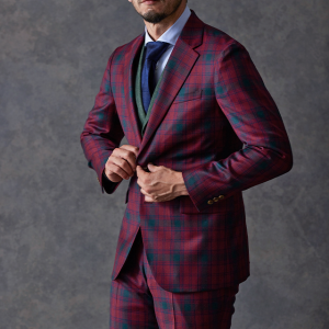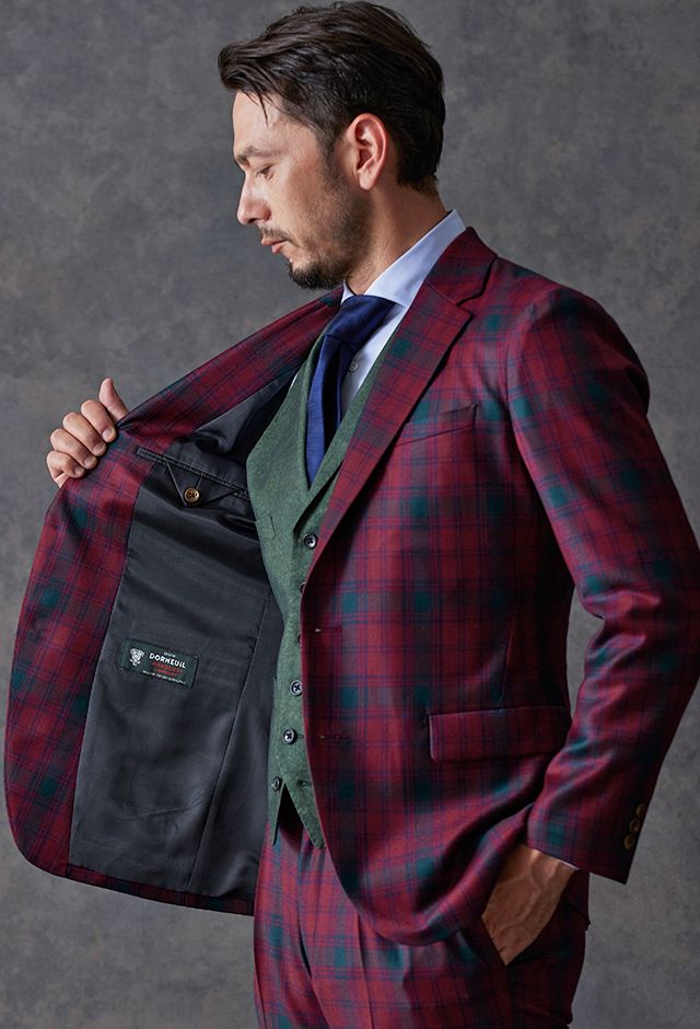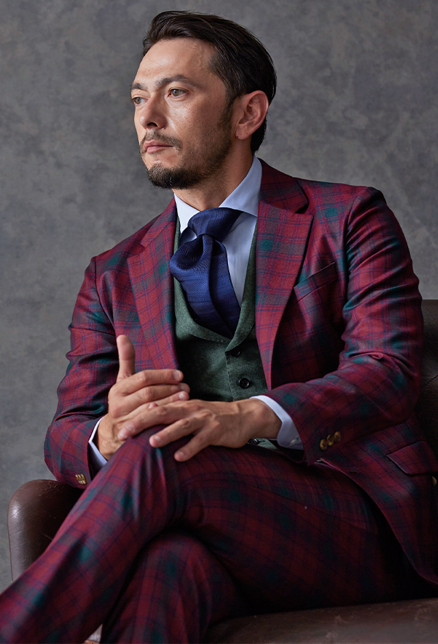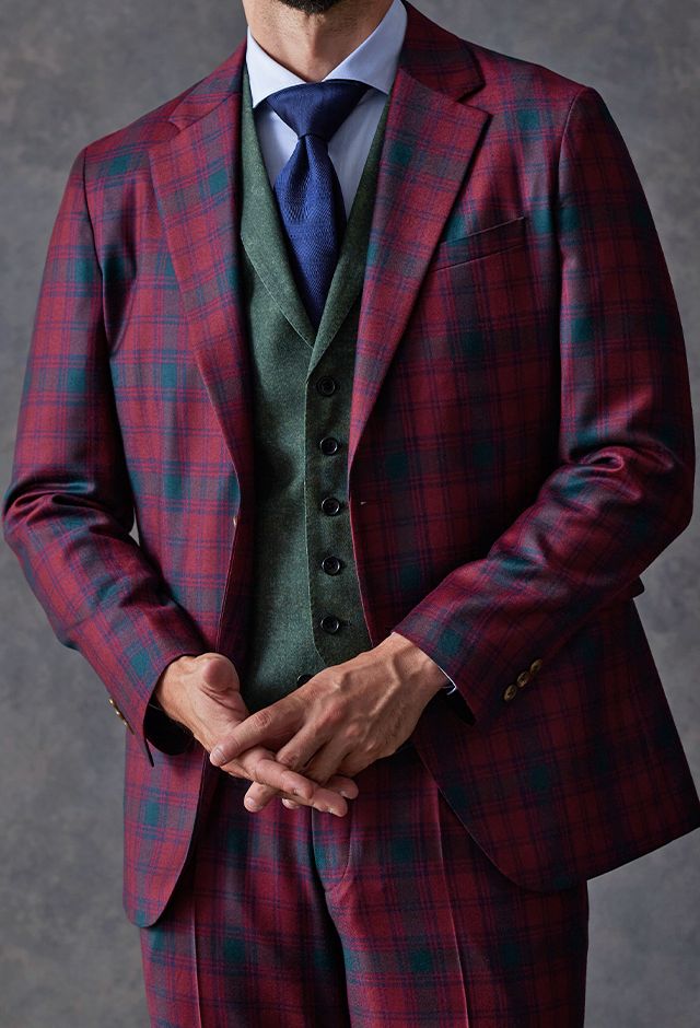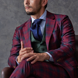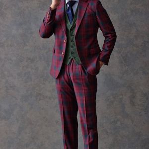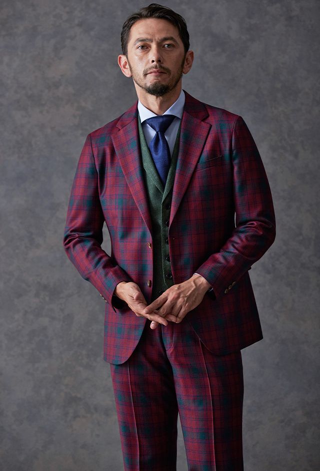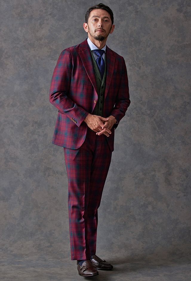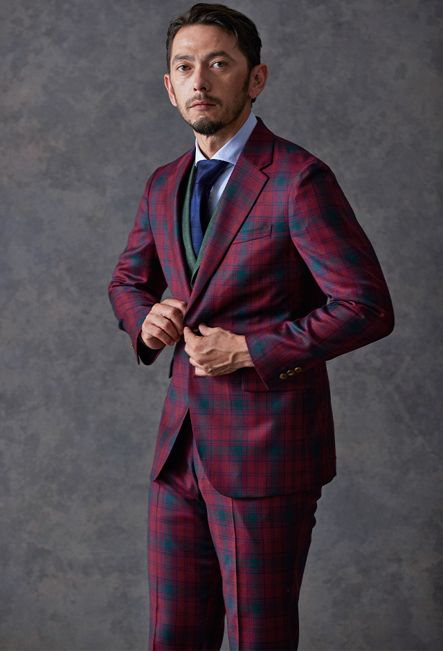 80ケ国以上にファンを持つ世界的なイギリスブランド「ドーメル」で仕立てたスーツです。赤チェックの存在感が際立つスタイルで、秋冬シーズンの生地になります。肩パットや芯地を極力排したアンコンモデルでジャケットを仕立てました。パンツはノータックのスッキリとしたシルエットかつ存在感もあるので、ジャケット、パンツ別々での着回しにも重宝。グリーンのベストと合わせて、パーティー感を演出しました。シューズはダブルモンクでカジュアルな外しをしています。