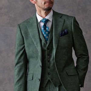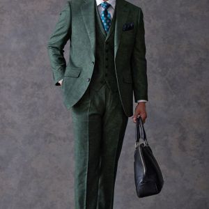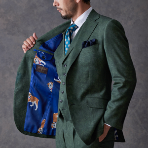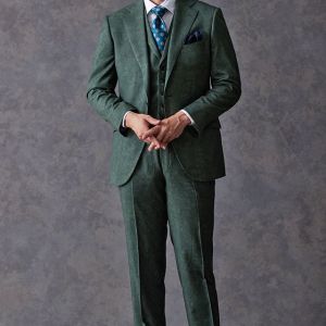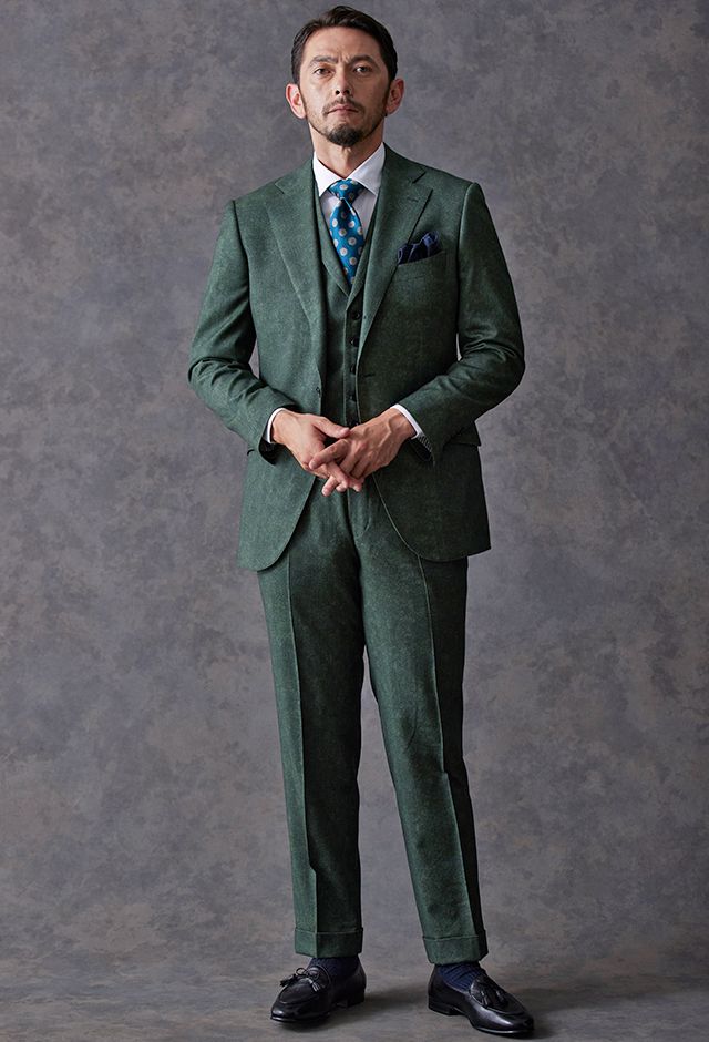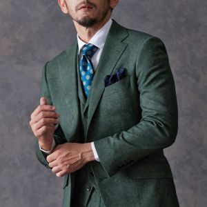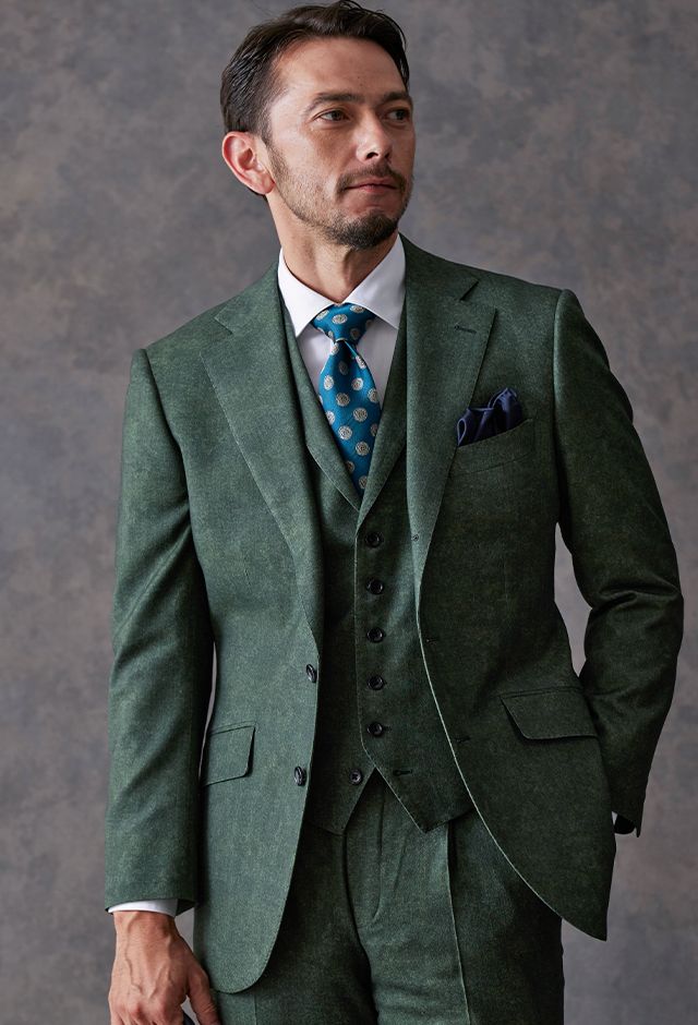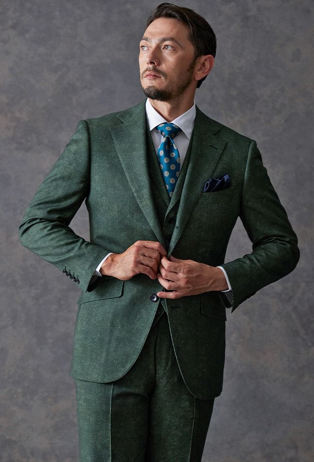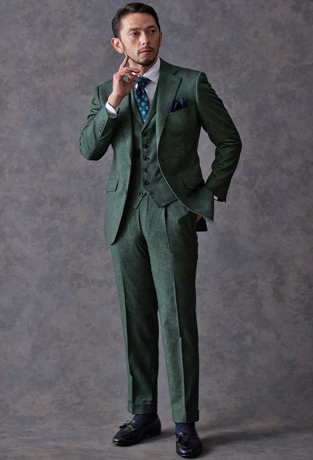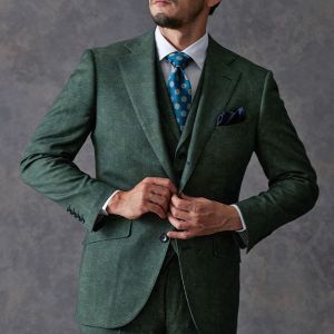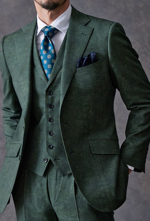 高品質でコストパフォーマンスに優れたイタリアブランド「カノニコ」で仕立てたスーツです。起毛感のあるシンプルな無地でどんなスタイルにも合わせやすい色味の、秋冬シーズンの生地になります。最高峰グレードの「カイザーモデル」で極上の着心地を味わうことが出来ます。襟付きベストのスリーピースでクラシカル感を演出。カジュアルな色の中にもカッチリとした印象を。裏地は犬(ブルドッグ)の個性あふれるデザインで周りと差が出る1着に。シンプルなホワイト無地のシャツに合わせて使いやすさ重視にしました。