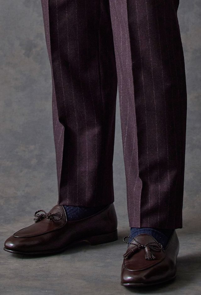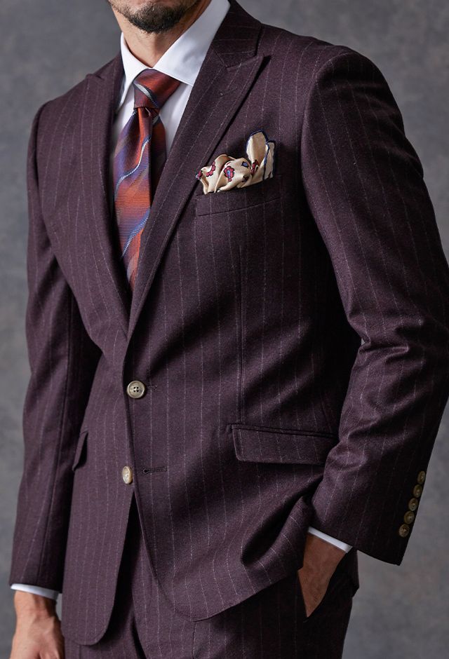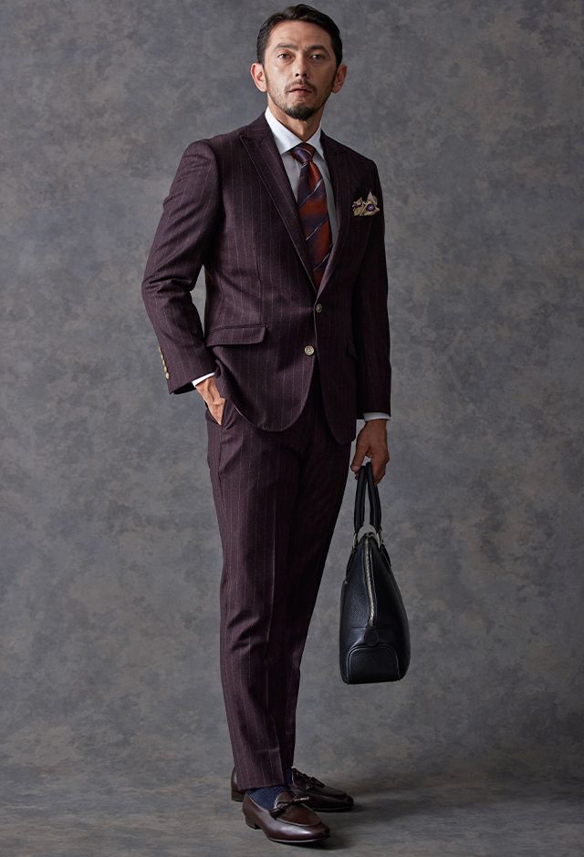 トレンドをふんだんに取り入れたデザイン性が特徴の「マルゾット」で仕立てたスーツです。着用時期に左右されにくいピッチのストライプで、オールシーズンの生地になります。モードな空気感を醸し出すことが出来るスリムフィットモデルで仕立てました。スラントポケットでさらにシャープ感を出し、裏地も同系色で統一感をプラス。ボタンも色味を外してオーダー感を演出.シャツはシンプルなホワイト無地で使いやすさ重視にしました。ネクタイにも赤みのあるカラーを組み合わせて色気のある仕上がりです。