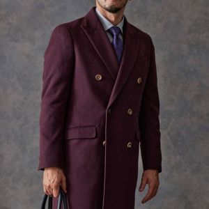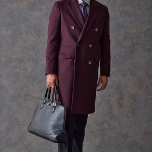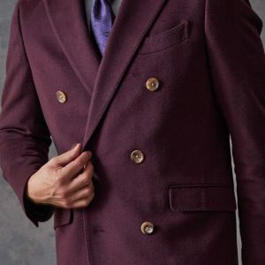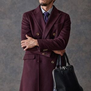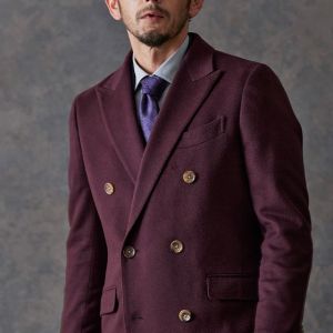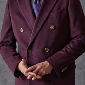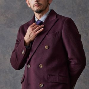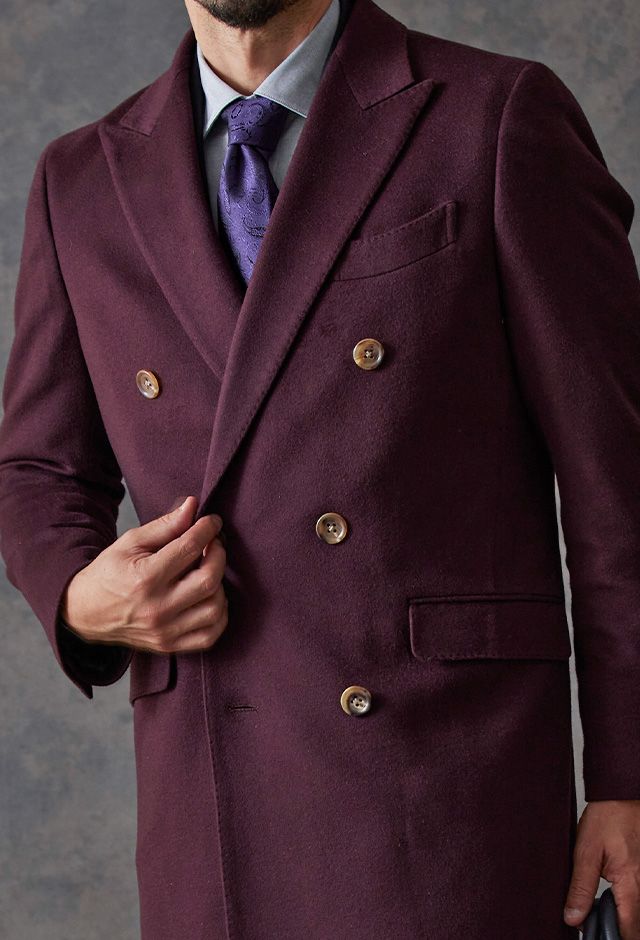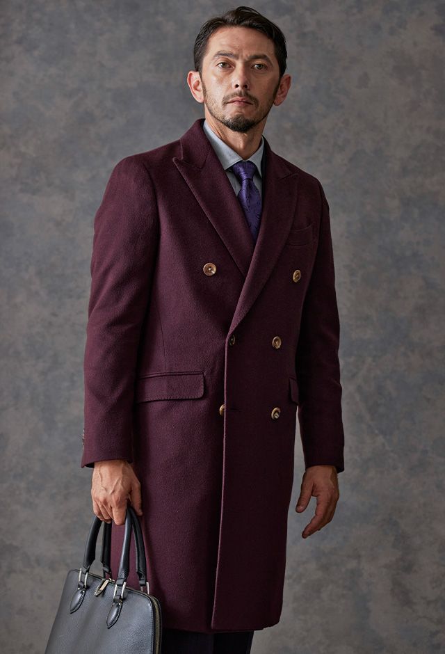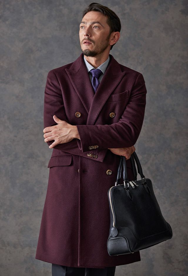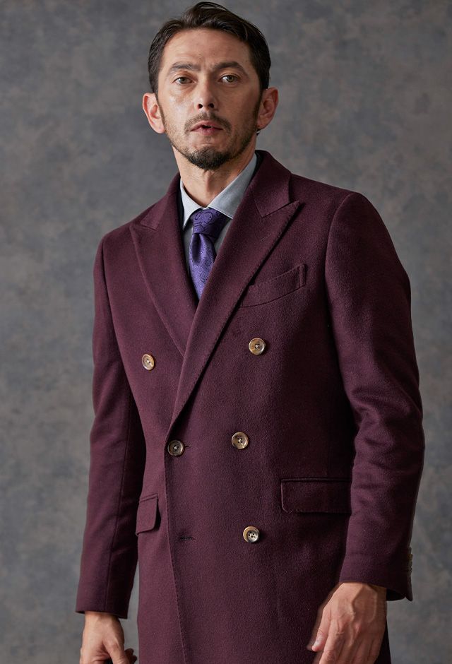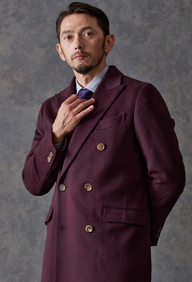 最高級の原材料を使用することを徹底し、世界的に評価される品質を保つ「ピアチェンツァ」で仕立てたコートです。珍しいボルドー色の無地柄で、上品でありながらカジュアルにも合わせることができる歴史のあるチェスターコートモデルでダブルで仕立てました。マーブルのボタンでアクセントをプラス。ダブルブレストにしてクラシック感を出しつつ、オーダー感も同時に演出。シャツはシンプルなホワイト無地で使いやすさ重視にしました。